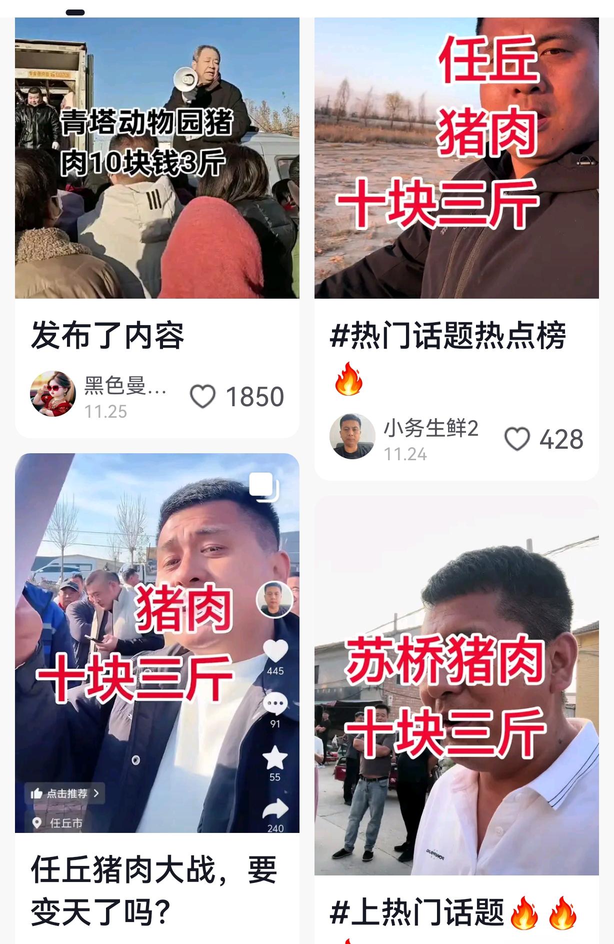 今天刷抖音刷到了一件新鲜事,卖猪肉的打PK,看谁卖的便宜,看谁坚持到最后。 猪肉十块钱三斤,排骨八块钱一斤。 毛猪都五六块钱一斤,这是疯了吗。 首先让人怀疑的不是好猪肉,可卖猪肉的老板说,猪肉经过了各种卫生检测,都符合标准,想想也是,要是不合格,他不敢在集市上大张旗鼓的卖,而且声势浩大,卖了也不是一天两天。 他们选择的集市都是大集,人流量都非常大,像任丘的北汉、辛中驿,离我们村也就十多里地。 我看了好几个视频才明白,这就是打价格战,谁坚持不住了就退出,胜利的一方垄断市场。