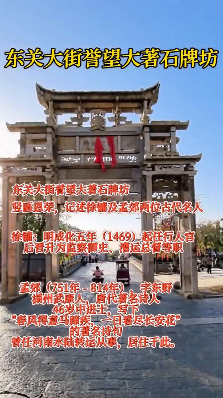 东关大街誉望大著石牌坊,竖匾恩荣,记述徐铺及孟郊两位古代名人。 徐铺:明成化五年(1469)起任行人官,后晋升为监察御史、漕运总督等职。 孟郊(751年-814年),字东野,湖州武康人,唐代著名诗人。46岁中进士,写下"春风得意马蹄疾,一日看尽长安花"的著名诗句。曾任河南水陆转运从事,居住于此。