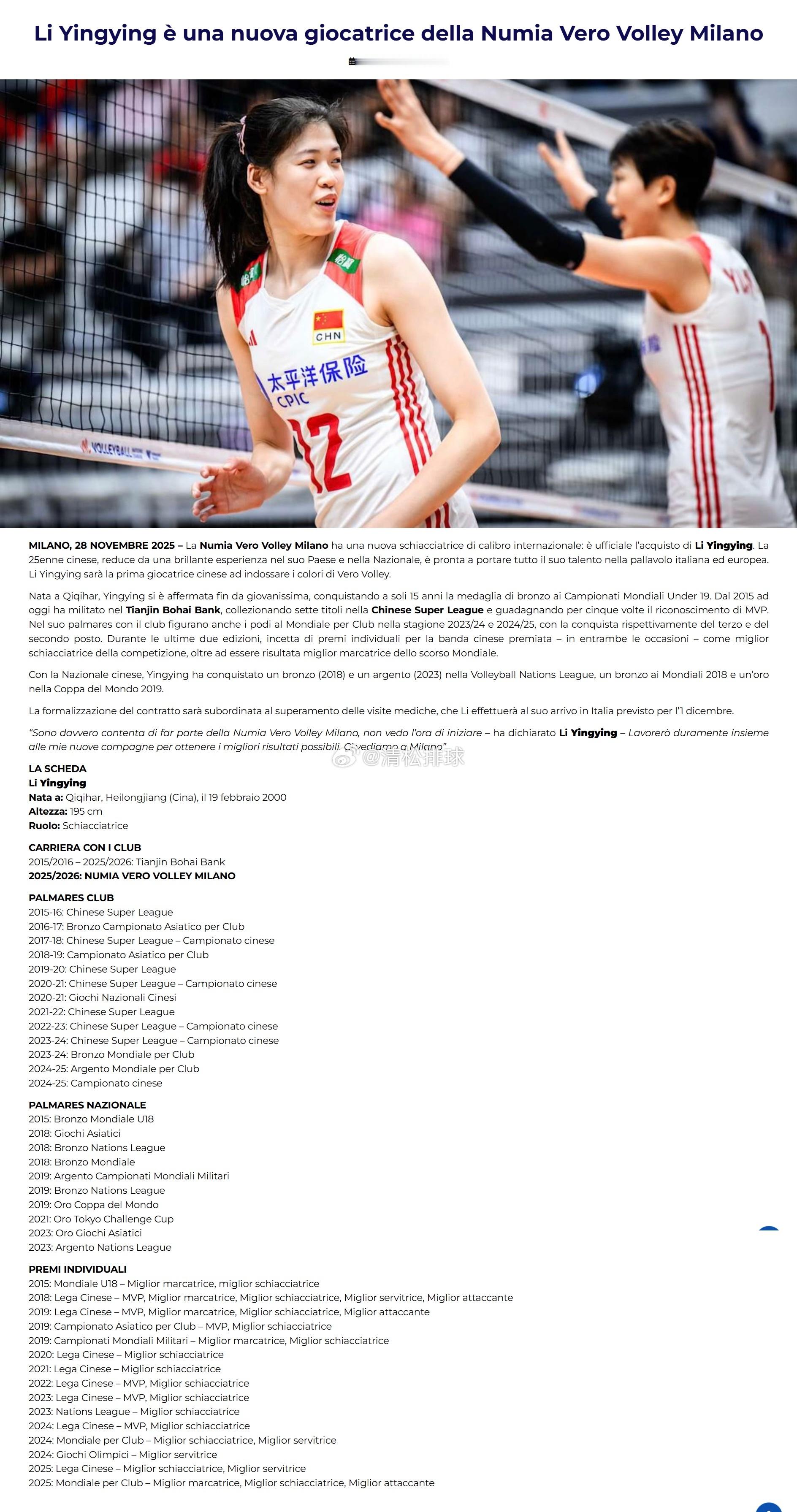 意大利米兰女排官网列出了李盈莹过往国家队、俱乐部及个人奖项【个人奖项】2015年U18女排世锦赛:最佳主攻2017-2018联赛:MVP、最佳主攻2018-2019联赛:MVP、最佳主攻2019年女排亚俱杯:MVP2019年军运会:最佳主攻2019-2020联赛:最佳主攻2020-2021联赛:最佳主攻2021-2022联赛:MVP、最佳主攻2022-2023联赛:MVP、最佳主攻2023年世界女排联赛:最佳主攻2023年女排世俱杯:最佳主攻2023-2024联赛:MVP、最佳主攻2024年女排世俱杯:最佳主攻2024-2025联赛:最佳主攻清松带你看排球李盈莹