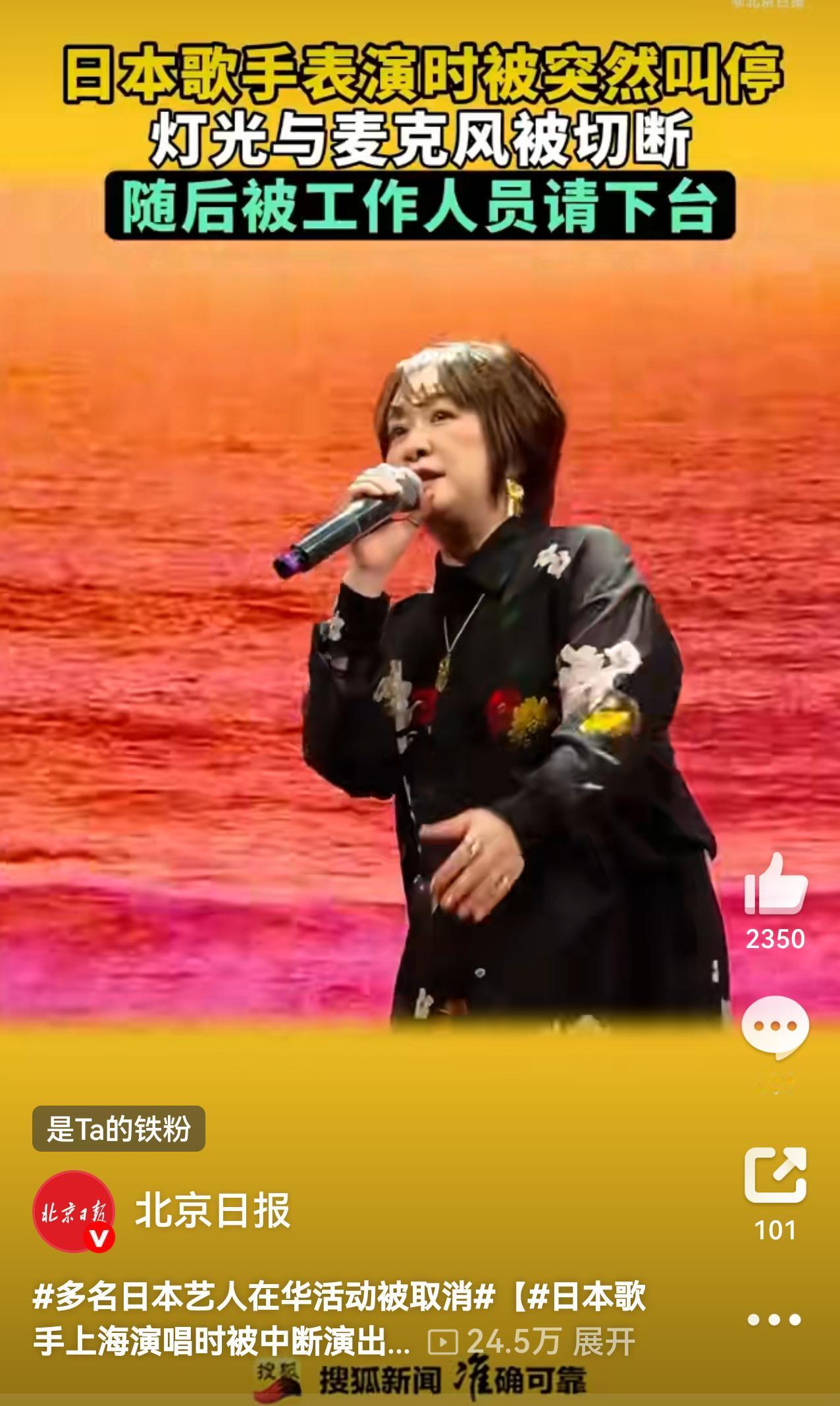 目前中日关系敏感,取消日本艺人的演出合情合理。不过,取消可以提前通知,人家已经开始表演的,把灯光和麦克风切了,然后把人赶下台,这种方式的取消真有点尴尬。早干嘛去了……