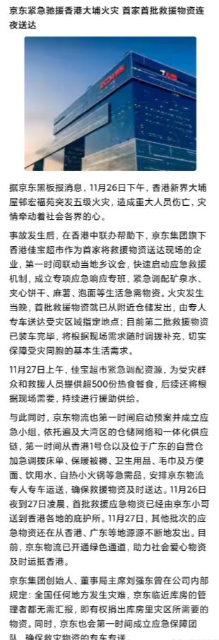 当国家社会发生灾难时,就近仓储无需汇报直接捐。这次香港大埔宏福苑大火,京东物流启动预案,从大湾区调拨物资。并且所属的香港佳宝超市成为首家将物资送达现场的企业。 香港大埔宏福苑的大火真是太揪心了,伤亡那么多人,好好的家一下就没了,想想都难受。 但灾情刚一出来,京东那边立马就动起来了,真没让人失望。 咱们常说救急如救火,这话一点不假,灾难面前最耽误不起的就是时间,京东这次完全做到了 “快准狠” 的援助。 你知道不,京东早有规矩,全国不管哪儿出事,附近仓库的负责人不用层层汇报,直接就能把灾区需要的物资捐出去,这次香港着火,这个规矩直接就用上了。 火灾是 26 号下午发生的,京东旗下的香港佳宝超市当天晚上就把第一批物资送过去了,是所有企业里第一个送到现场的,这速度简直了。 他们送的都是最实在的东西,矿泉水、泡面、饼干这些,都是受灾的同胞当下最急需的,渴了能喝,饿了能吃,太及时了。 不光佳宝超市,京东物流也没闲着,第一时间就启动了应急预案,还专门成立了应急小组。 关键是他们在大湾区的仓库太管用了,香港本地有 1 号仓,广东那边还有自营仓,物资都就近备着,根本不用从老远调。 连夜就把床单、被褥、卫生用品这些东西往庇护所送,26 号夜里到 27 号凌晨,第一批物资就由京东小哥送到各个庇护所了。 要知道当时特区政府刚开放了好几个庇护中心,七百多人等着安置,这些被褥、毛巾送过去,大家晚上就能少受点罪,真是解了燃眉之急。 第二天早上,佳宝超市又接着送了五百多份热食,不管是受灾的群众还是救火的工作人员,能吃上口热乎饭,心里都能暖和点。 而且第二批物资早就装上车了,就等着现场说需要啥,立马就能送过去。 京东物流还开了绿色通道,不光送自己的物资,社会上的爱心物资也能跟着一起快速运到香港,这格局真可以。 其实能这么快,根本不是碰巧,一方面是京东这 “不用汇报直接捐” 的规矩立得好,少了层层审批的麻烦,仓库负责人当场就能拍板,这在灾难面前太重要了,多耽误一分钟都可能误事。 另一方面是他们的仓储网络真不是盖的,大湾区这边香港和广东的仓库连成片,物资就在跟前,调货、运输一路顺畅,没有半点卡壳的地方。 这可不是临时抱佛脚能做到的,都是平时就准备好的。 你看,这次火灾发生后,中央港澳办立马派了工作组去香港帮忙,特区政府也开放庇护所、发援助金,还有好多香港市民自发当义工搬物资,整个社会都在使劲。 京东这波操作就是企业里的表率,没有光喊口号,而是真金白银地送物资,还送得这么及时。 佳宝超市作为香港本地的企业,第一时间站出来,京东物流从内地调物资支援,这不就是同胞之间互相帮衬的样子嘛。 现在物资还在源源不断地送过去,佳宝超市的门店也保证物资充足,不管受灾的同胞缺啥,基本都能满足。 京东还一直跟特区政府保持沟通,说随时等着调遣,需要啥就给啥。 这种担当真的让人佩服,不是做样子给人看,是实实在在解决问题。 所以说,“就近仓储不用汇报直接捐” 这办法太对了,灾难面前就得这么干,企业有担当,制度给支撑,物资就在身边,才能最快地帮到受灾的人。 京东这次不光救了急,更让香港的同胞感受到了支持,这种时候,咱们就是一家人,有事一起扛。 这种实实在在的援助,比啥都强,也让大家看到,不管出啥事儿,总有人第一时间站出来帮忙。 京东紧急驰援香港大埔火灾 首家首批救援物资连夜送达 2025-11-28 11:11·极目新闻