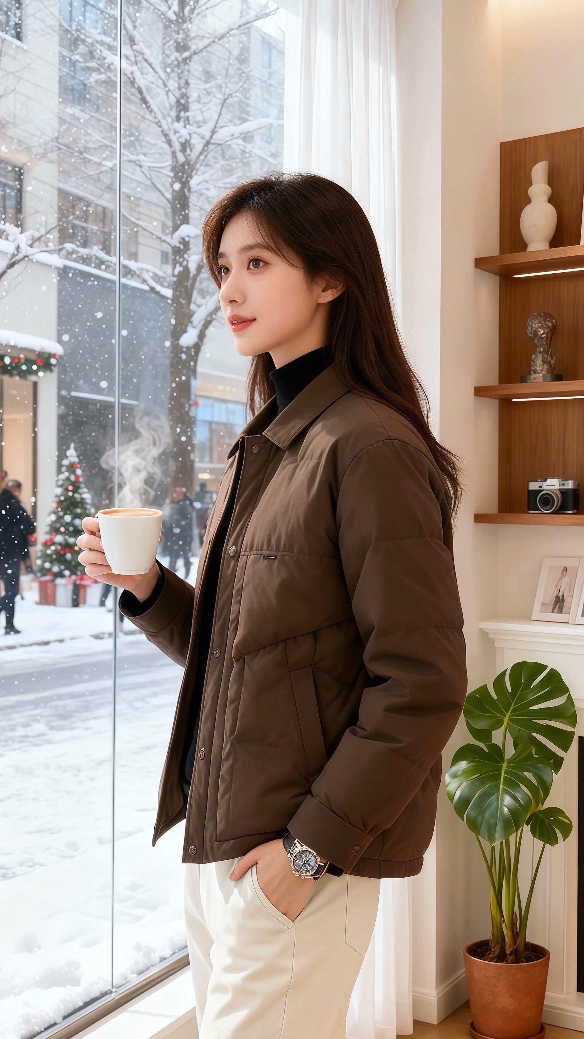 他放下伞走过去,指尖碰了碰她外套的翻领:“这颜色裹在你身上,比壁炉还暖半分。”