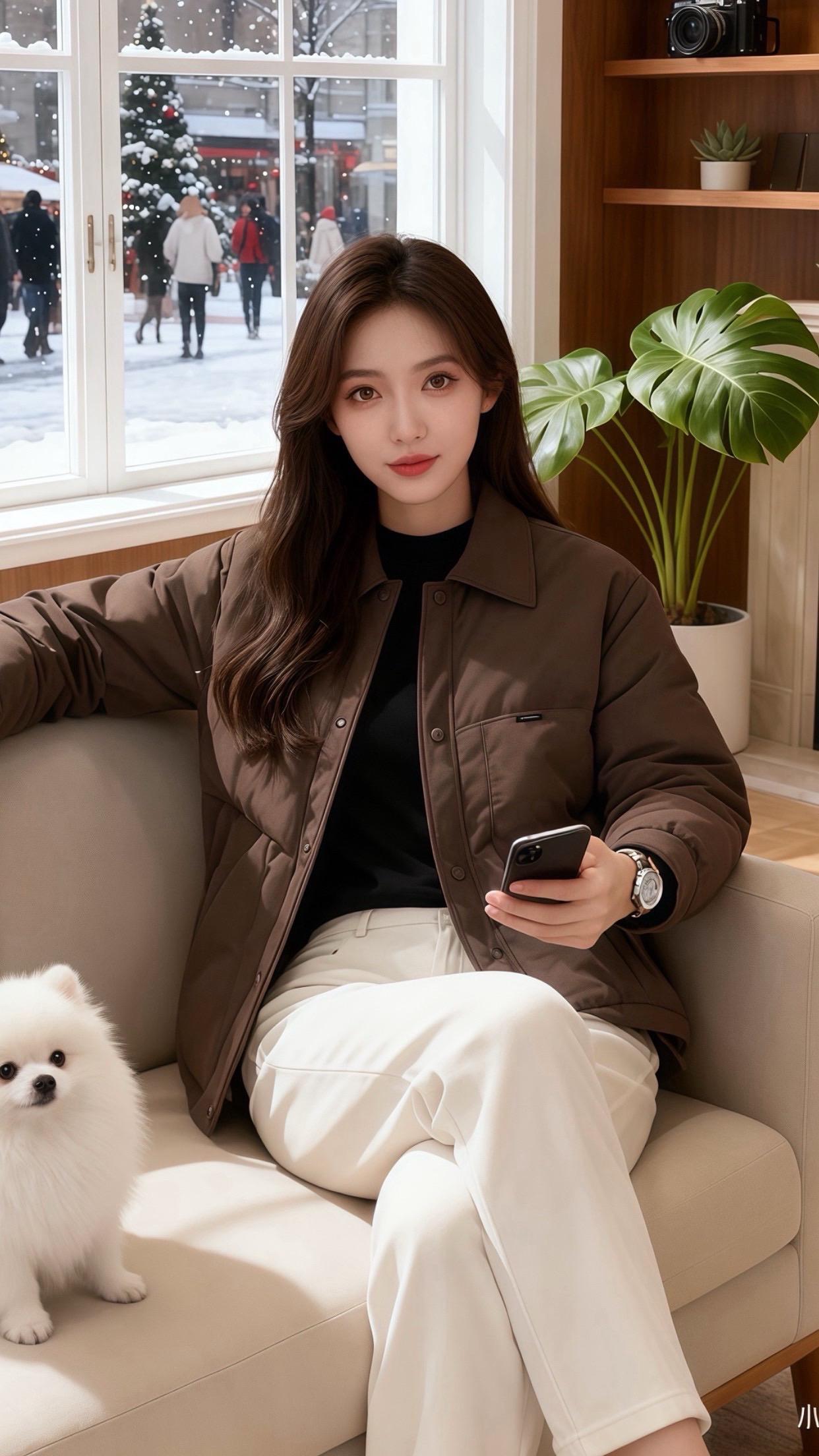 许妍蜷在沙发里刷手机,博美蜷在她膝头团成雪球。皓明推门进来时,目光先落在她身上——深棕外套的质感像浸了热可可的绒布,衬着米白裤装,把窗外的雪都衬得软了。