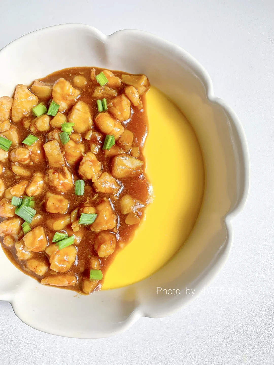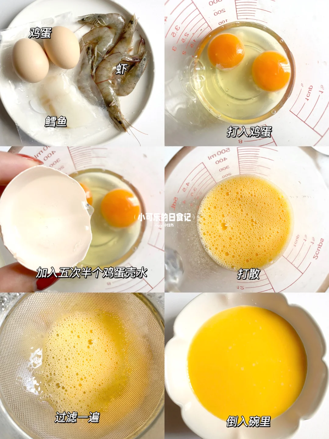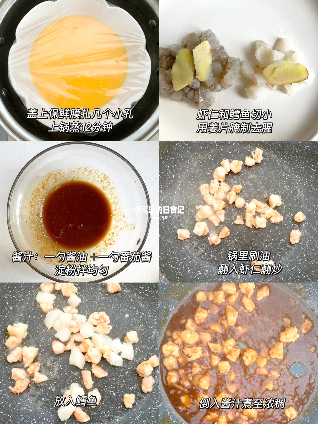 每周都会给女儿安排两次鳕鱼,今天分享一道巨好吃的鳕鱼蒸蛋,这个搭配真的绝了,超嫩滑,做法也简单,妈妈们快安排起来吧~ . 🌟食材: 鲜虾 小葱 鸡蛋2个 真鳕鱼 酱汁:一勺酱油➕一勺番茄酱➕少许淀粉拌均匀 . 🌟做法: 1⃣️打入鸡蛋,加入五次半个鸡蛋壳的水,打散 2⃣️过滤一遍,倒入碗里,盖上保鲜膜扎几个小孔 3⃣️上锅蒸12分钟,虾仁和鳕鱼切小用姜片腌制 4⃣️锅里刷油,倒入虾仁翻炒,放入鳕鱼,倒入酱汁煮至浓稠 . 根据宝宝咀嚼能力处理食材大小。