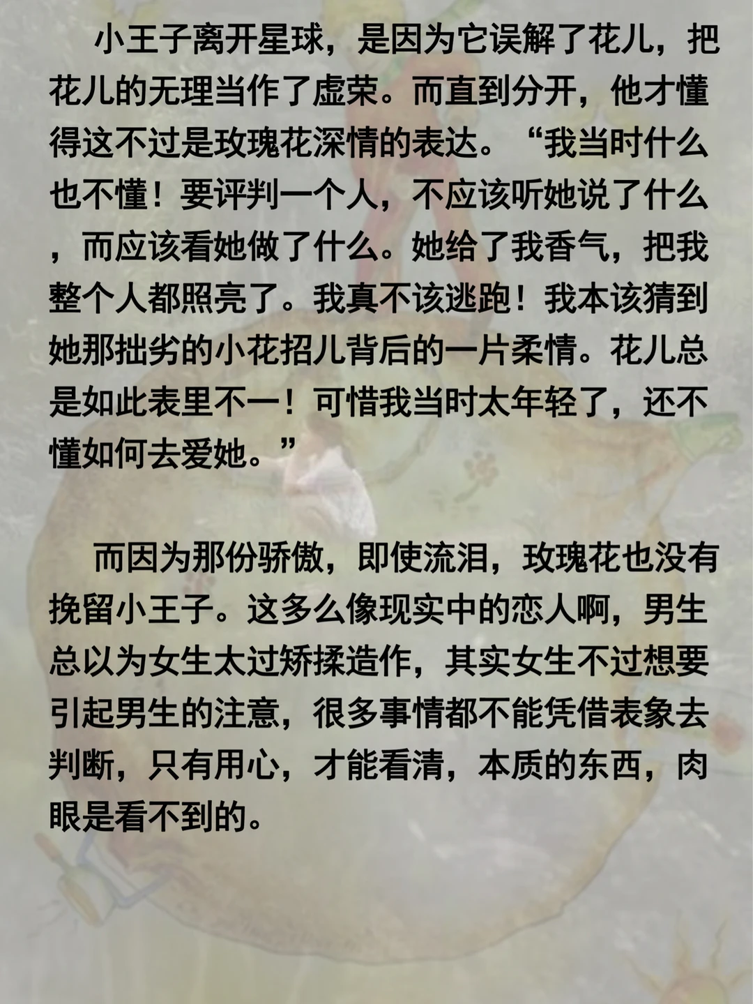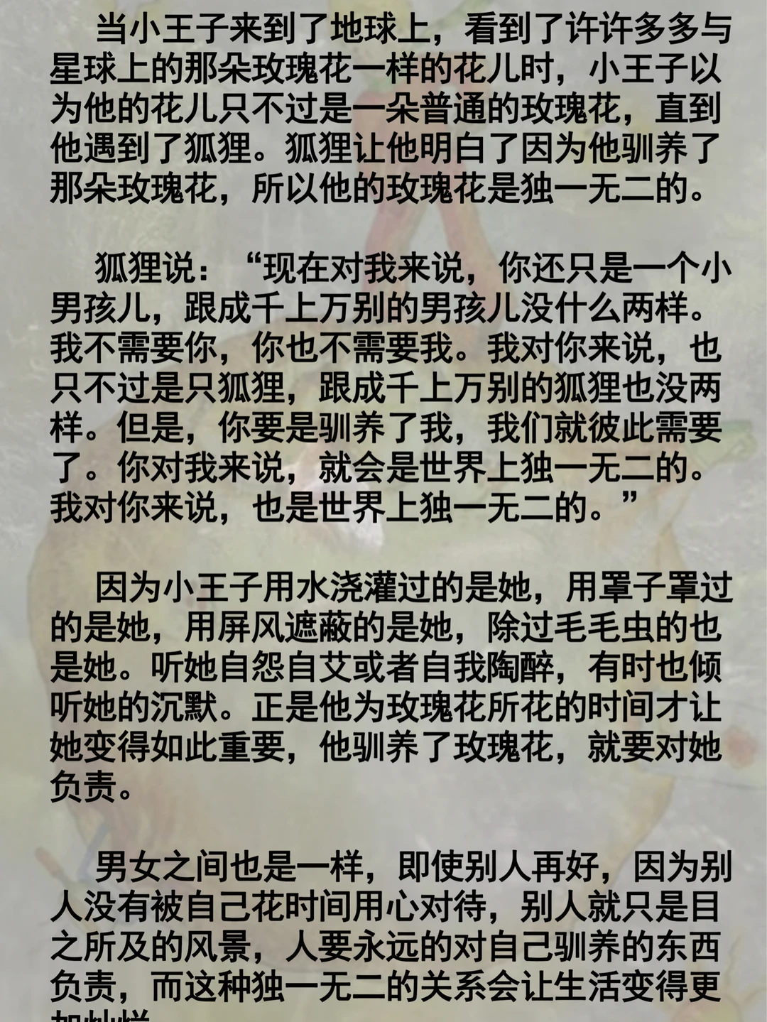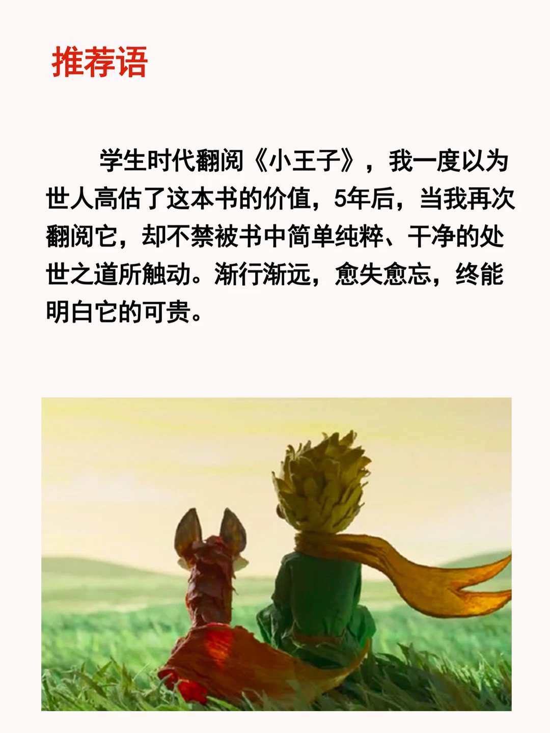 学生时代翻阅《小王子》,我一度以为世人高估了这本书的价值,5年后,当我再次翻阅它,却不禁被书中简单纯粹、干净的处世之道所触动。渐行渐远,愈失愈忘,终能明白它的可贵。 美好的爱情能让生活变得更加灿烂,同时也能丰盛一个人的灵魂。就如同小王子所说“如果你爱上了一颗星星上的一朵花儿,夜晚你看着天空,就会觉得很美。所有的星星都像开满了花儿。” 小王子选择返回星球,是因为他明白了那朵玫瑰花的珍贵,想要对玫瑰花负责。愿我们也能遇到那个想要驯服或者甘愿被驯服的人,然后花一生的时间用心对待。 !