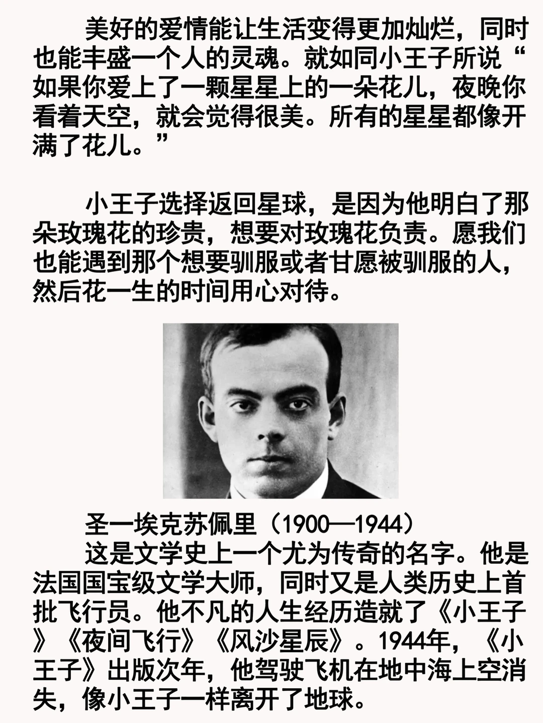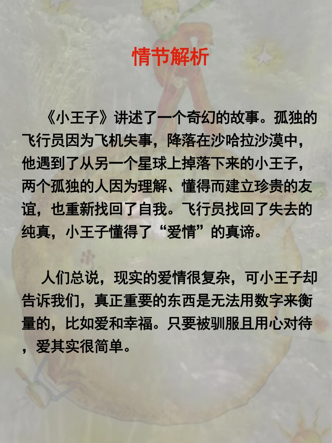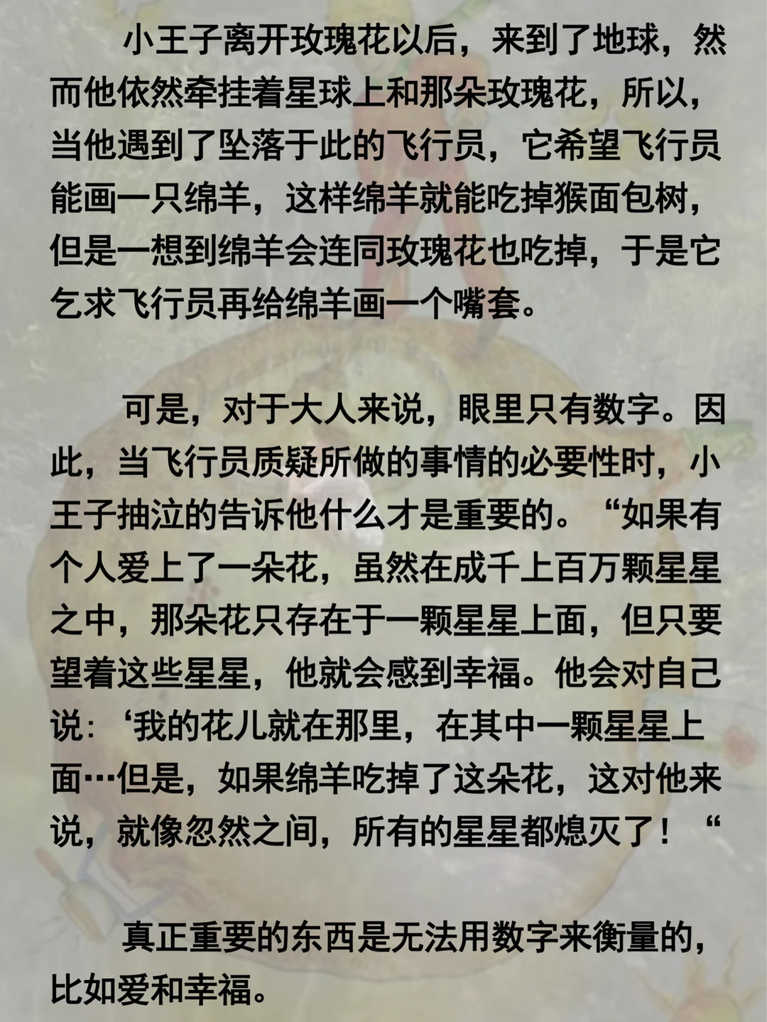 学生时代翻阅《小王子》,我一度以为世人高估了这本书的价值,5年后,当我再次翻阅它,却不禁被书中简单纯粹、干净的处世之道所触动。渐行渐远,愈失愈忘,终能明白它的可贵。 美好的爱情能让生活变得更加灿烂,同时也能丰盛一个人的灵魂。就如同小王子所说“如果你爱上了一颗星星上的一朵花儿,夜晚你看着天空,就会觉得很美。所有的星星都像开满了花儿。” 小王子选择返回星球,是因为他明白了那朵玫瑰花的珍贵,想要对玫瑰花负责。愿我们也能遇到那个想要驯服或者甘愿被驯服的人,然后花一生的时间用心对待。 !