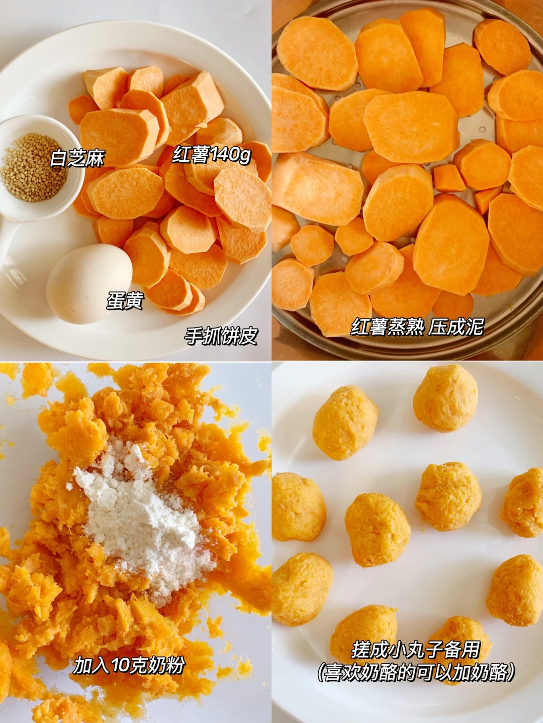 1⃣️红薯去皮切小块,上锅蒸熟,压成泥,加入10克奶粉,搓成小丸子(喜欢奶酪的话把奶酪包在红薯馅里)