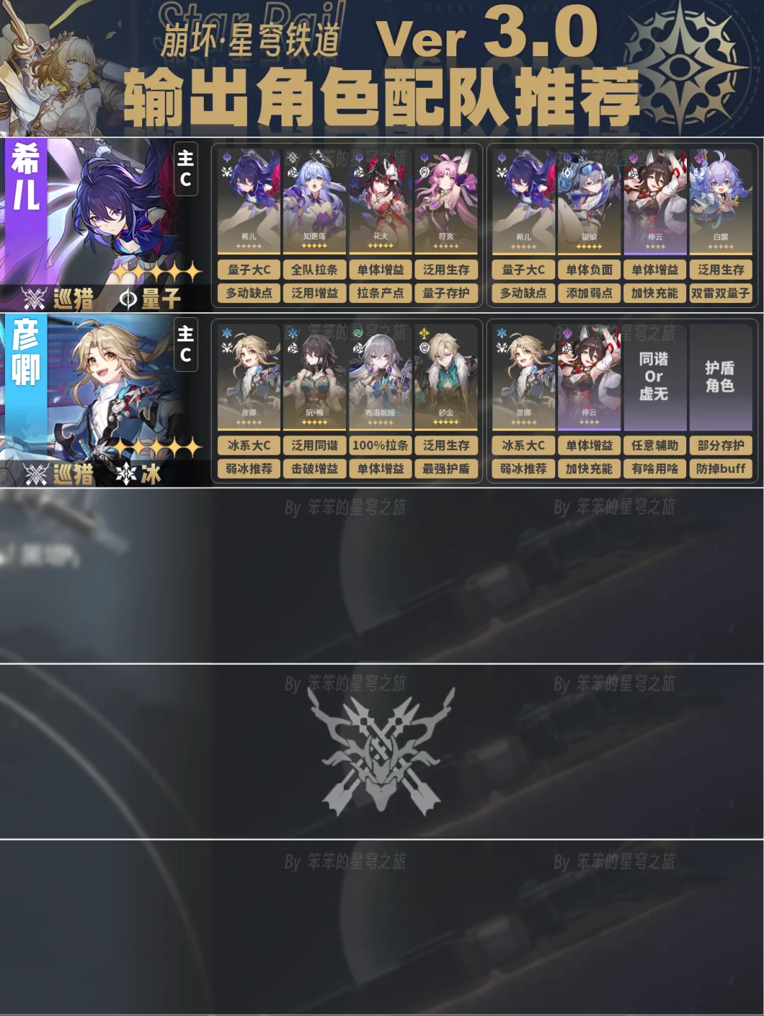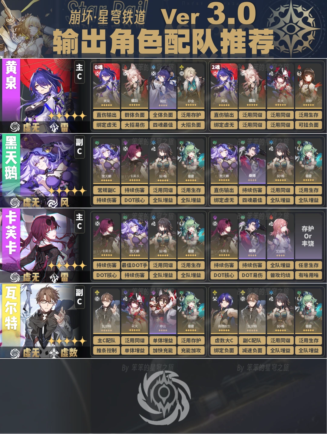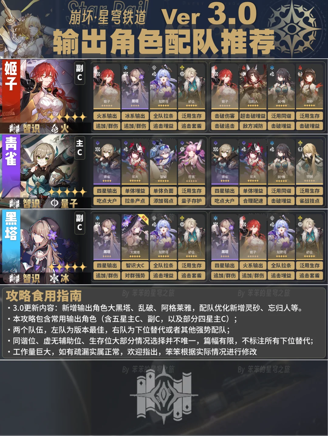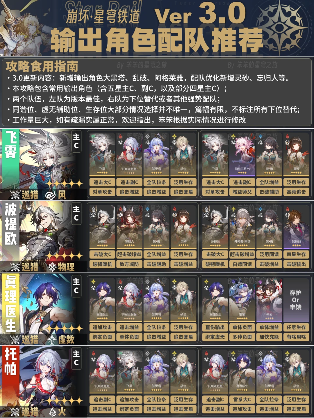 🐱大家好,我是笨笨的铲屎官 今天给大家带来的是3.0上输出角色配队 上个版本更新还是2.5呢 笨笨把期间新增的主c和辅助全部进行了更新 ------------------------------------ 👉注意事项: ①左边的配队为该角色最强配队 右边配队可能为下位替代、可能为其他强势队伍 不同角色二队选择并不一样 ②配队肯定不全面,仅供参考 ③同谐位、虚无位、生存位并不唯一 大家可根据自己卡池的角色适当调整 ④你在用什么配队,笨笨是否漏了 欢迎大家补充