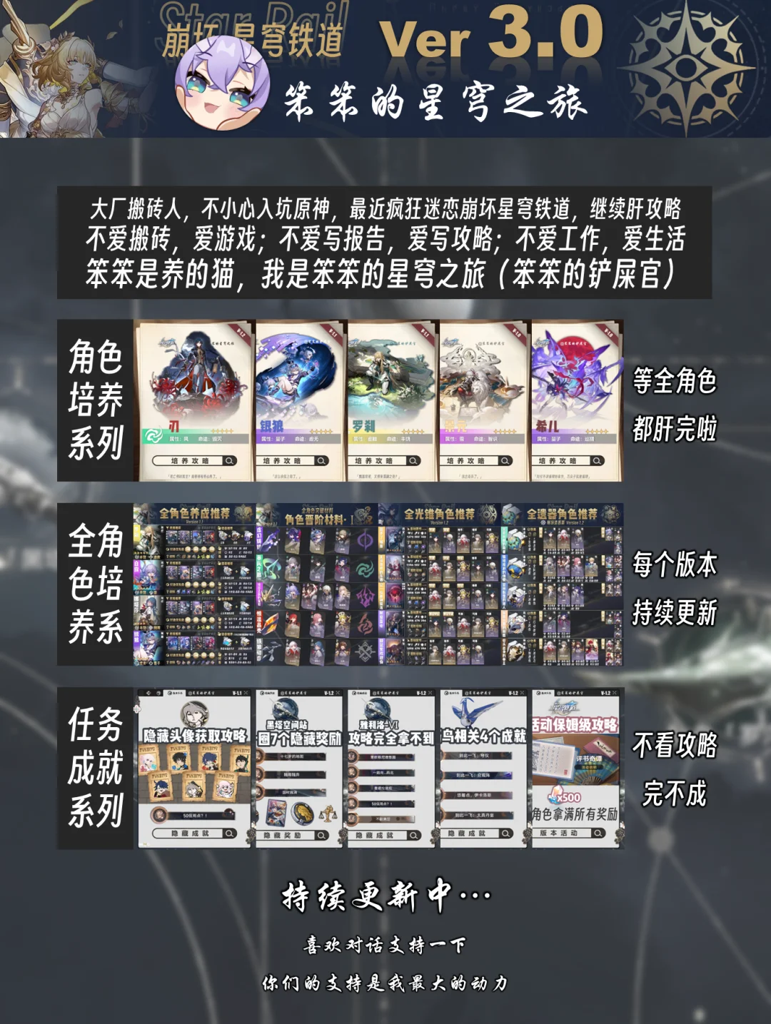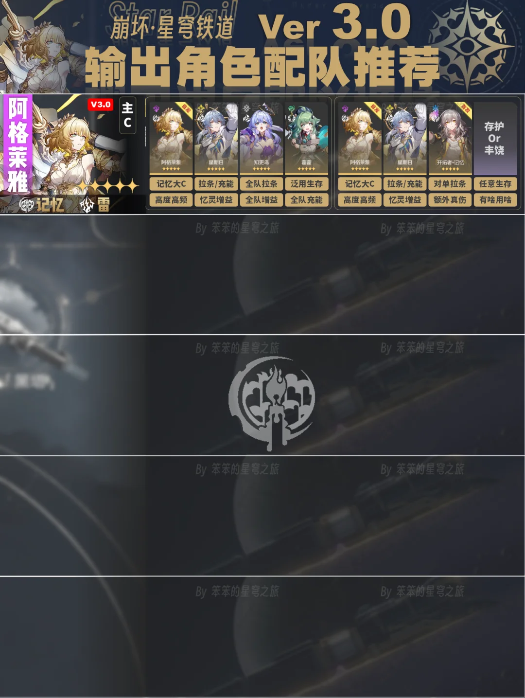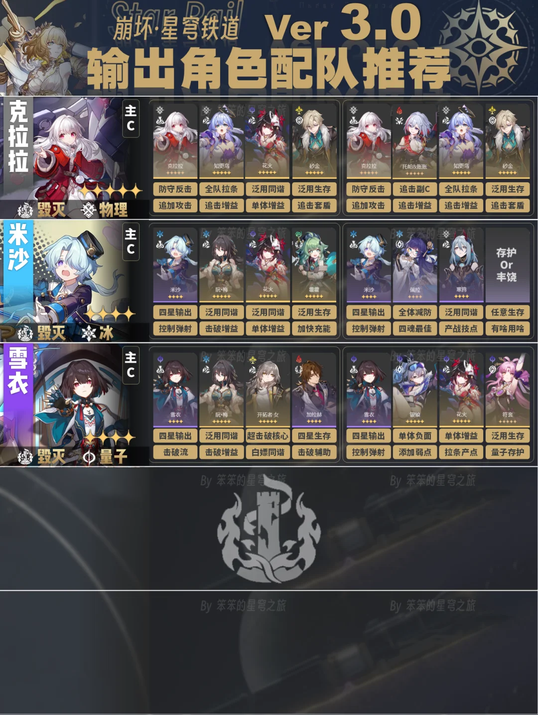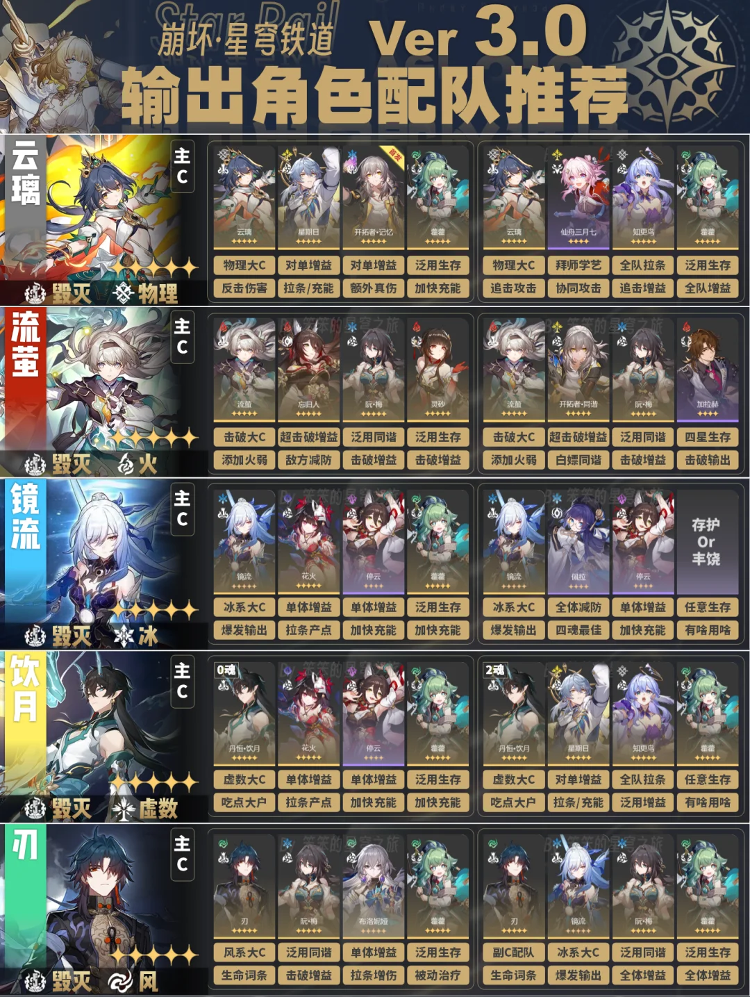 🐱大家好,我是笨笨的铲屎官 今天给大家带来的是3.0上输出角色配队 上个版本更新还是2.5呢 笨笨把期间新增的主c和辅助全部进行了更新 ------------------------------------ 👉注意事项: ①左边的配队为该角色最强配队 右边配队可能为下位替代、可能为其他强势队伍 不同角色二队选择并不一样 ②配队肯定不全面,仅供参考 ③同谐位、虚无位、生存位并不唯一 大家可根据自己卡池的角色适当调整 ④你在用什么配队,笨笨是否漏了 欢迎大家补充