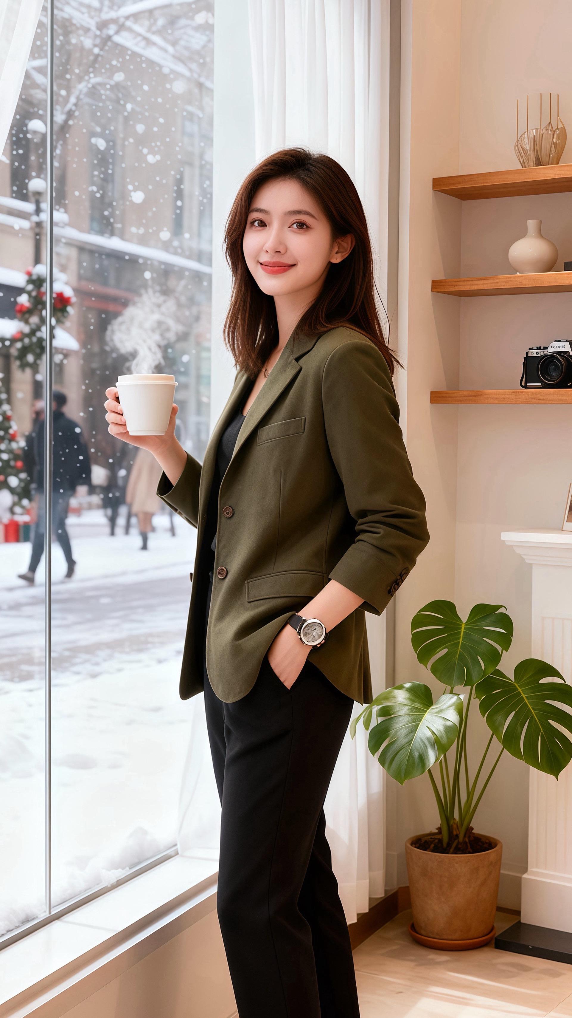 他推门时带了寒气,目光先落在她身上:“这身比上次的羊绒裙更衬你——西装软而挺,配黑裤像把冬风都收得温驯。”