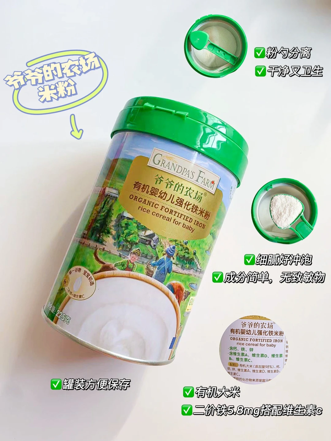 我家宝宝吃的是爷爷的农场米粉,铁含量高达5.8mg,而且是二价铁搭配维生素c,成分简单,无致敏物,适合宝宝初添加。有机的大米粉,冲泡后口感很细腻,不会起小疙瘩,宝宝很爱吃,罐装的方便存储,贴心的设计粉勺分离,用起来很方便。