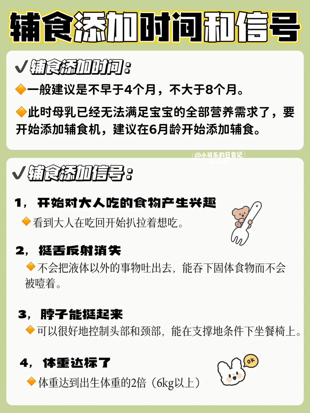 🔸体重达到了出生的两倍(或者以上)、可以独立自己坐了、对大人的食物感兴趣了、顶舌反应消失了。