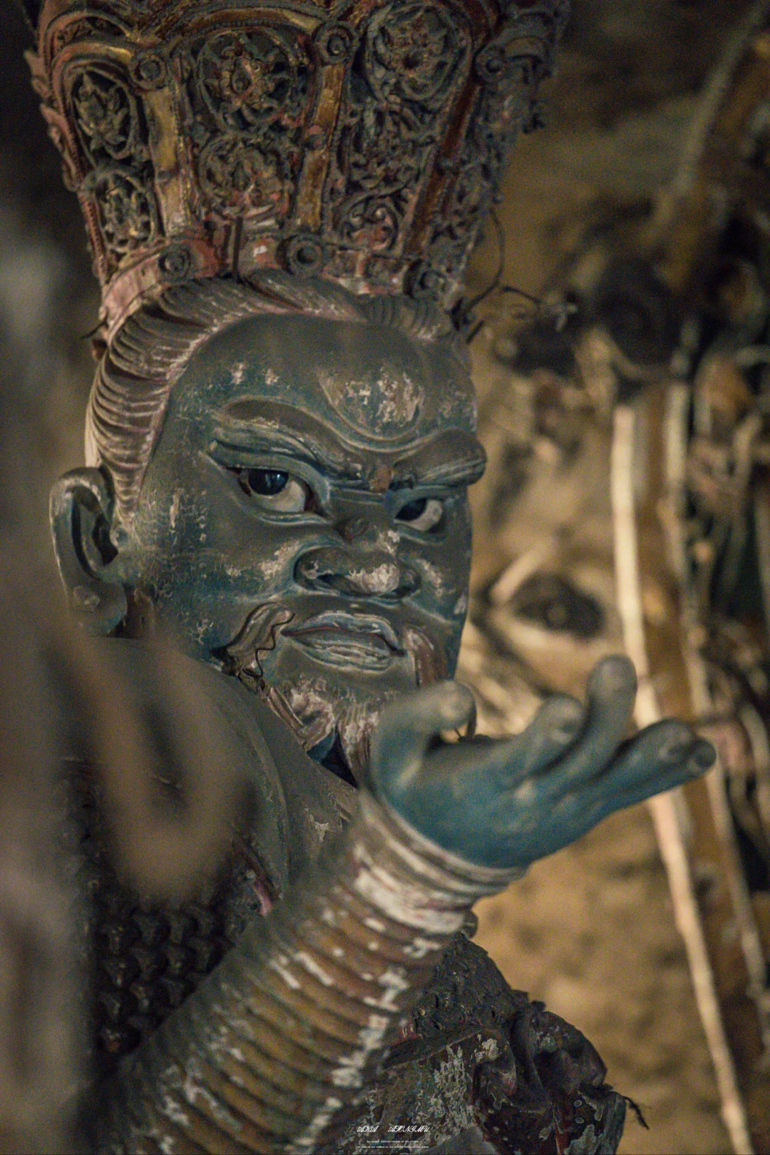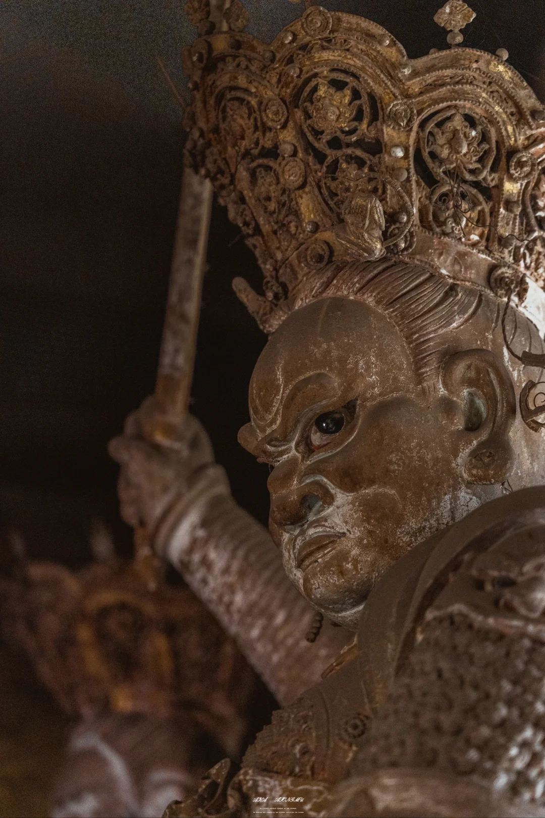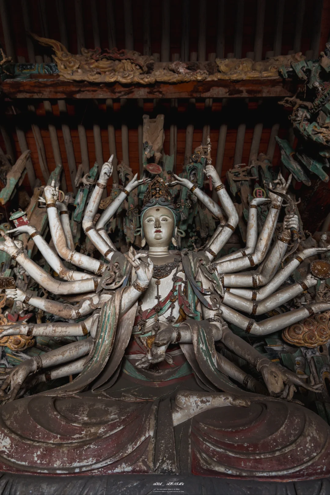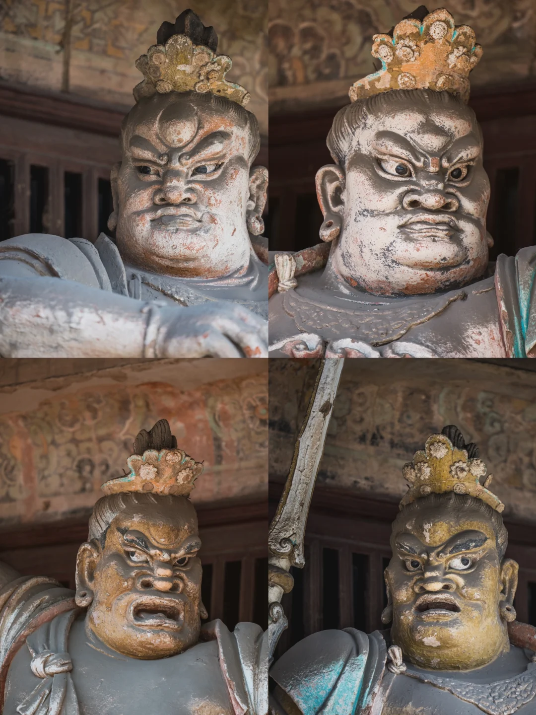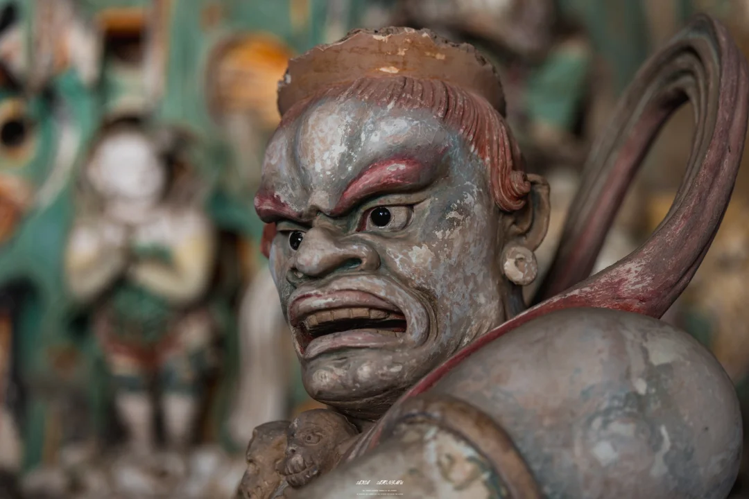 🗼最摄人心魄的当属千佛殿的韦陀像。这尊被誉为“全国韦陀之冠”的彩塑,身姿如蓄势待发的弓弦,腰部夸张的S形曲线与飞扬的飘带构成力学与美学的双重奇迹。匠人用红胶泥与黑琉璃镶嵌的眼眸,让神像的目光穿透六百年光阴,与每个驻足者完成一场无声对话。寺内2000余尊彩塑,从宋代的千手观音到明代的十八罗汉,每一道衣纹褶皱都是匠人指尖的温度