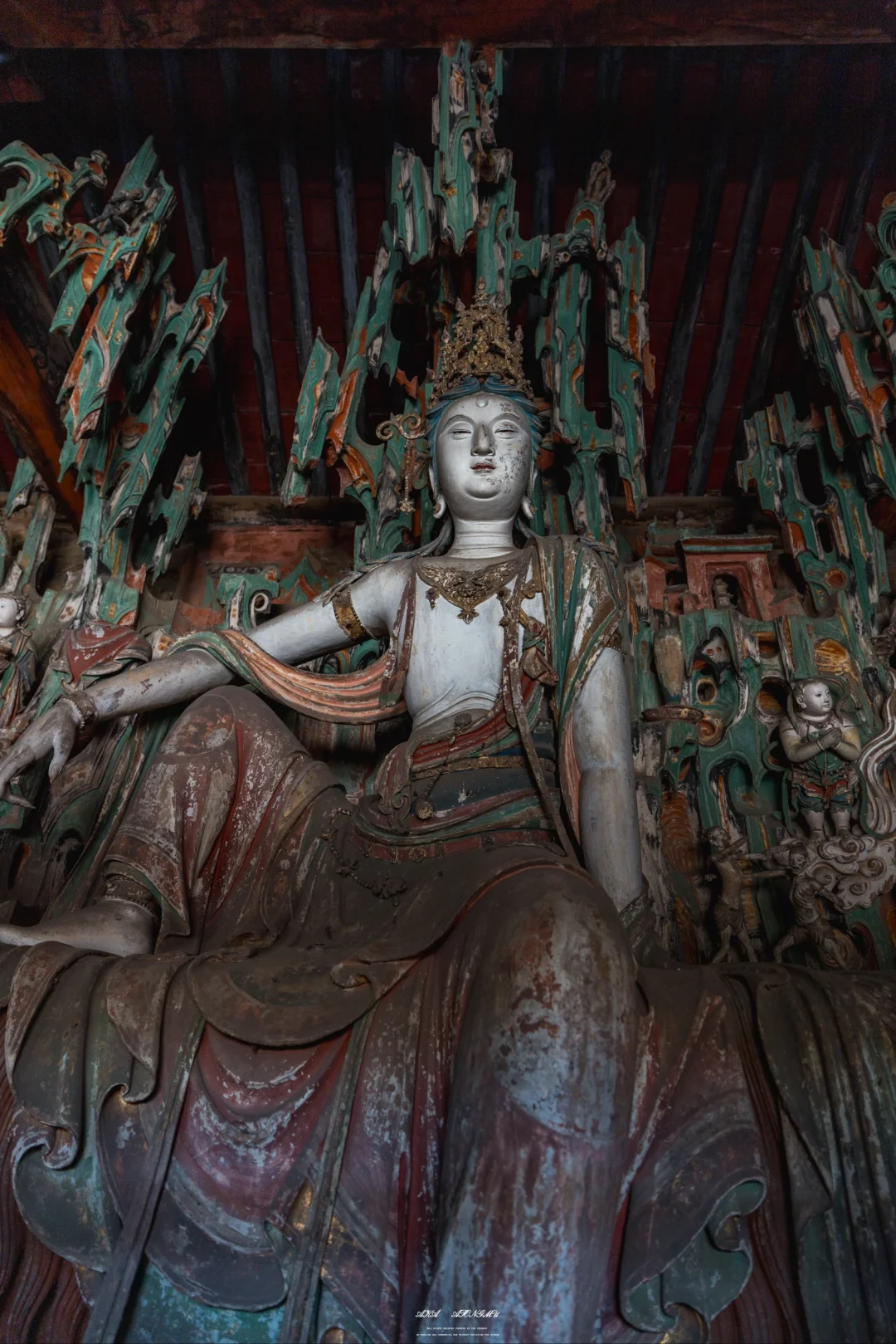 🗽踏入双林寺山门,便撞入一场跨越千年的视觉盛宴。四大金刚怒目圆睁,肌肉虬结的臂膀似要破壁而出,明代匠人以夸张的线条将护法神的威严凝固成永恒。而释迦殿内的渡海观音,却以截然不同的姿态诠释禅意——她单足轻点莲瓣,衣袂翩然若飞,身后惊涛骇浪与眉目间的从容形成极致反差,仿佛将观者从人间疾苦渡向彼岸极乐