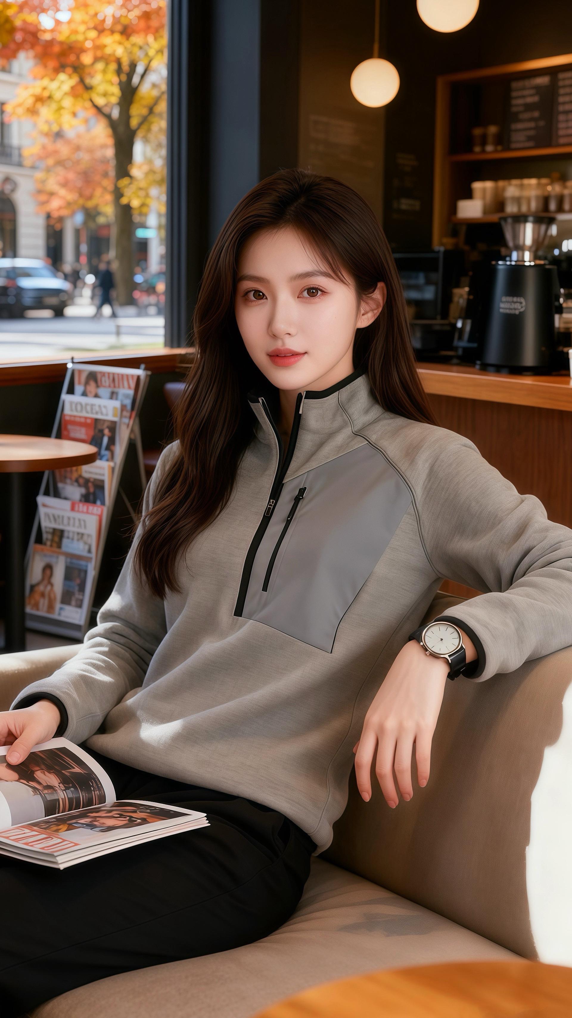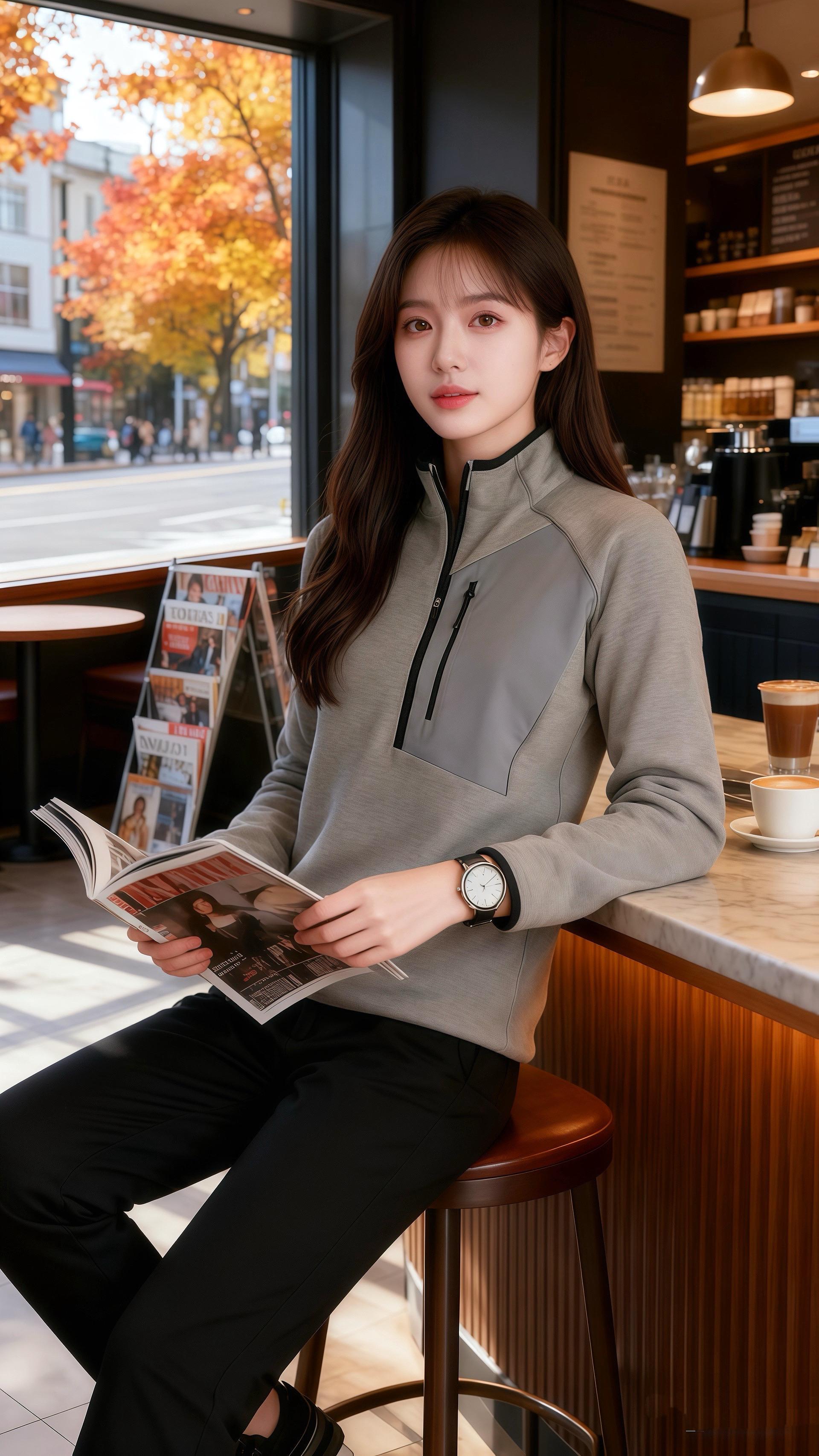 秋阳裹着梧桐叶的金红,漫进咖啡厅的落地窗时,苏清正蜷在沙发里翻杂志。她身上的灰调半拉链衫,拼块面料衬得肩线软而舒展,和黑裤搭出松快的利落——左手腕那只男士手表,是陈屿上个月送的,表带软韧,刚好贴着手腕的温度。