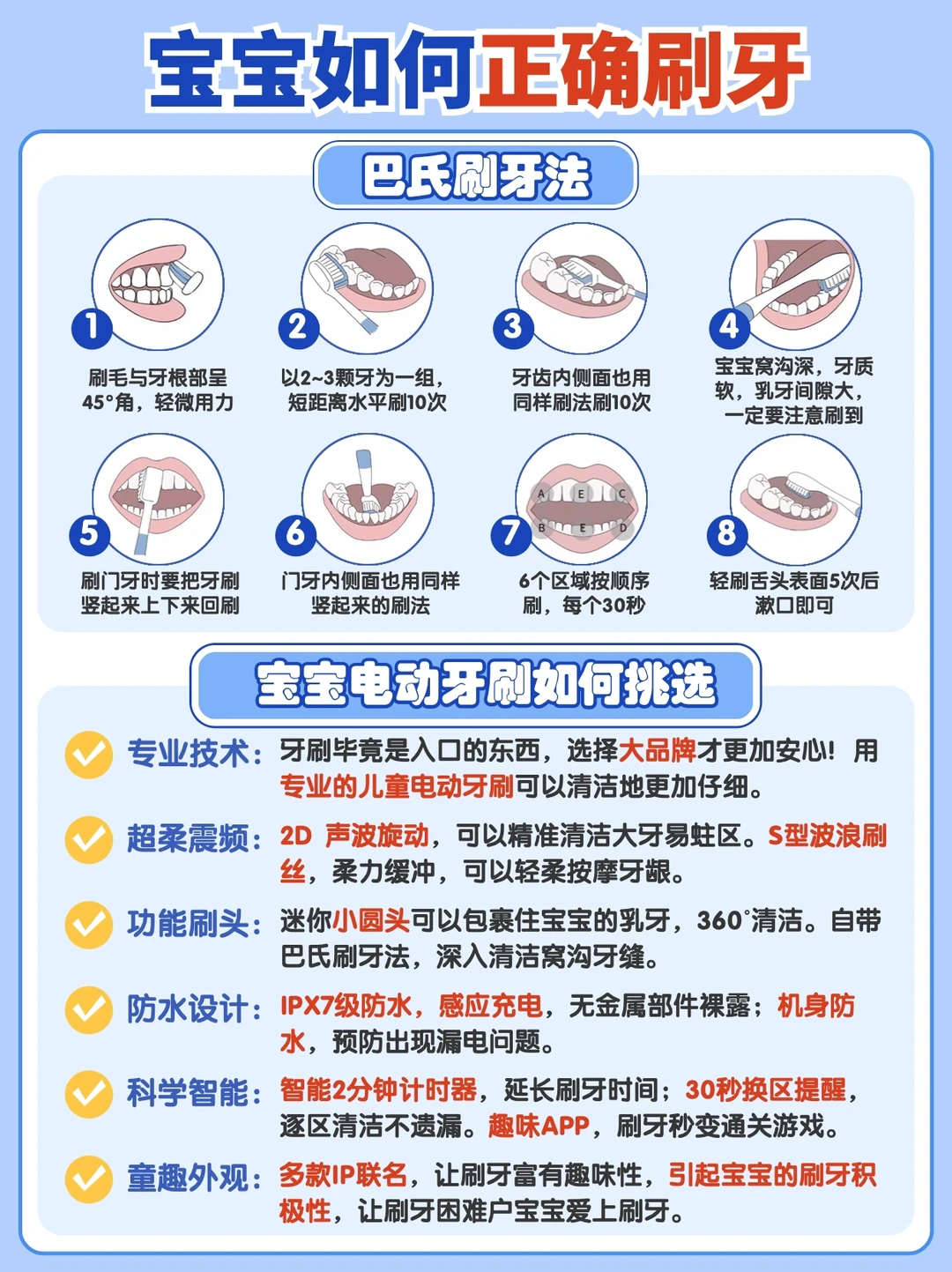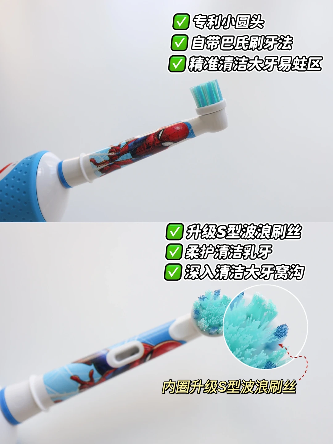 💯它的迷你小圆很好入口,可以包裹住宝宝的乳牙,360˚清洁,让口腔里的脏东西无路可退!它还自带巴氏刷牙法,升级了超柔护2D声波旋动,可以清洁窝沟牙缝,精准清洁大牙易蛀区。