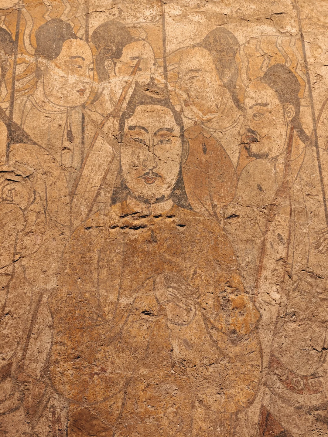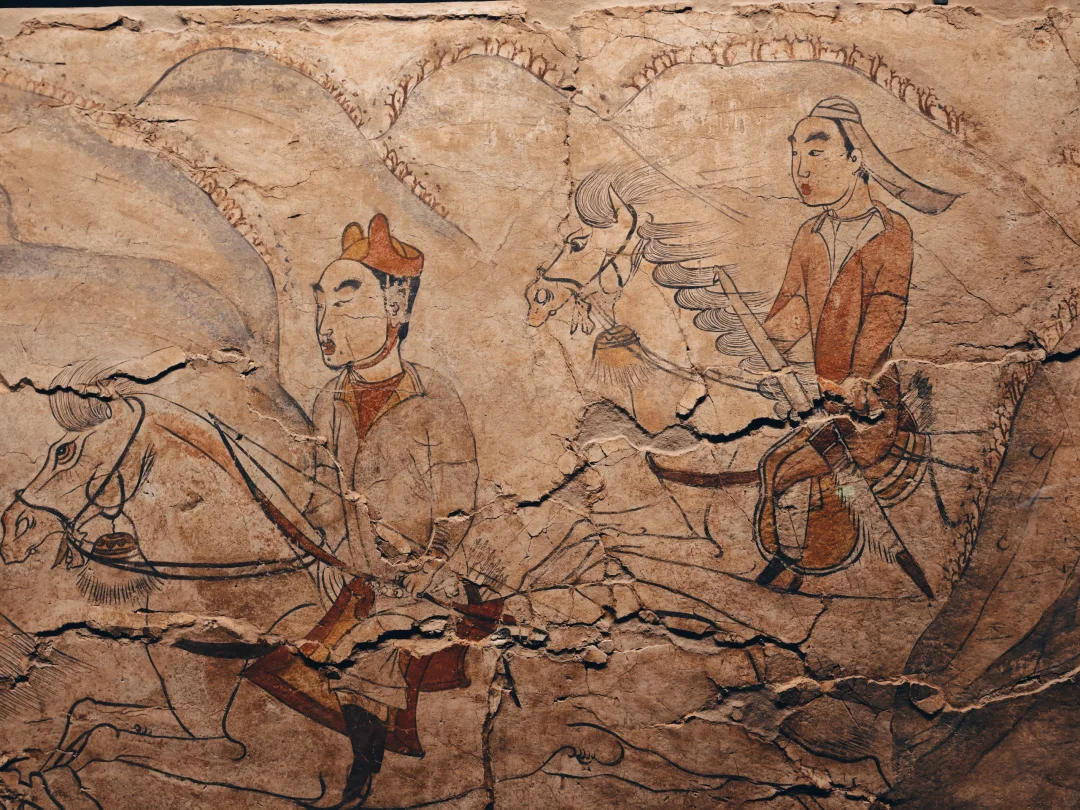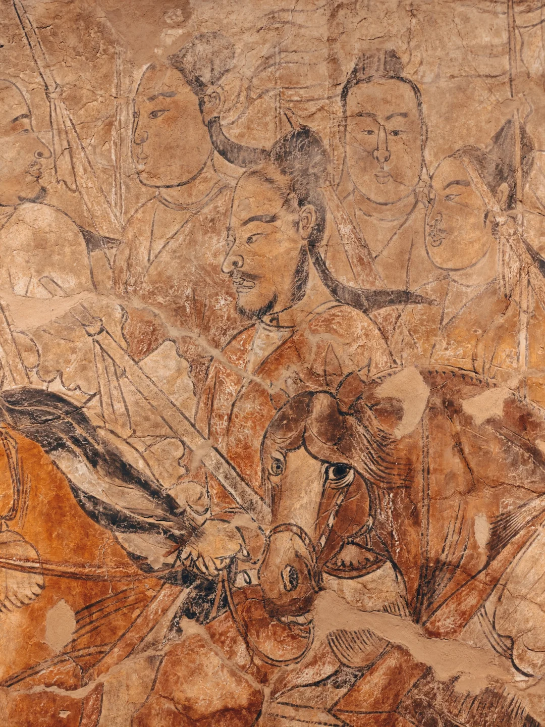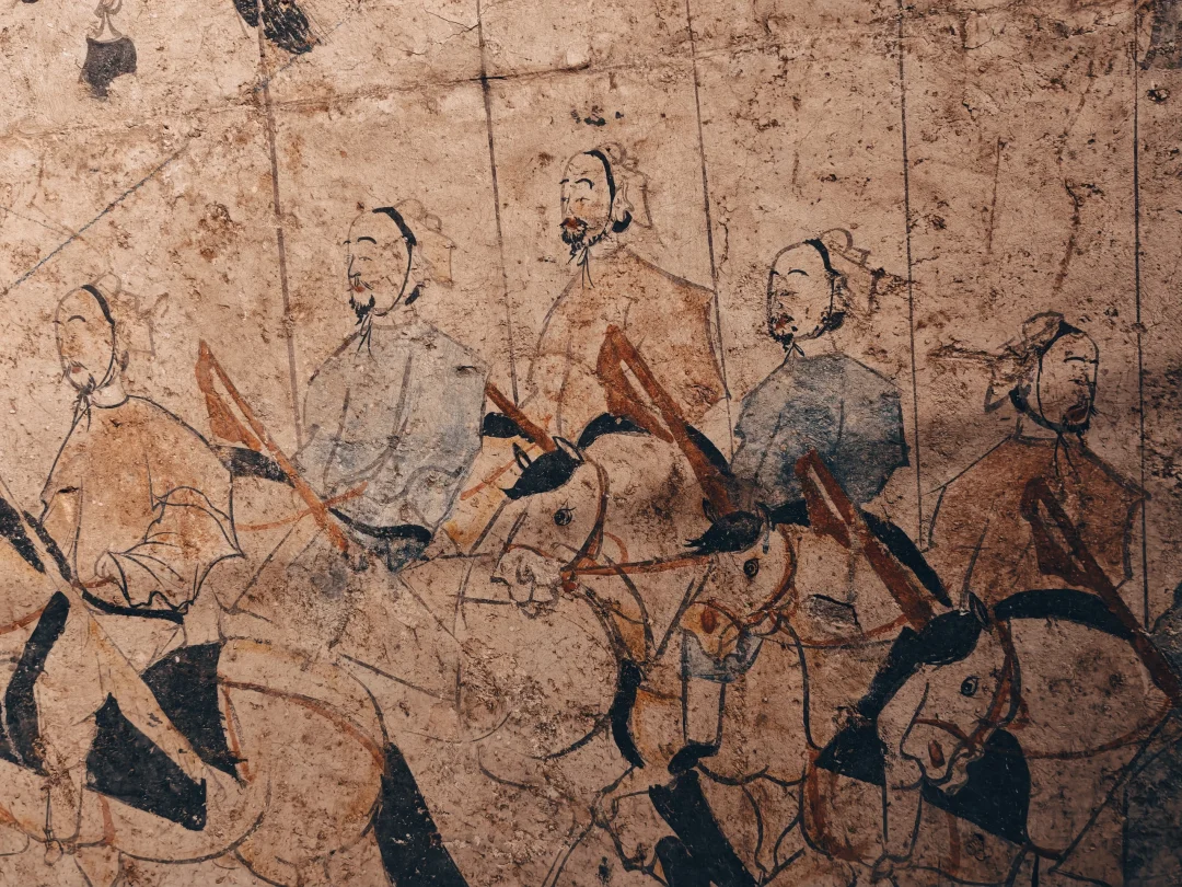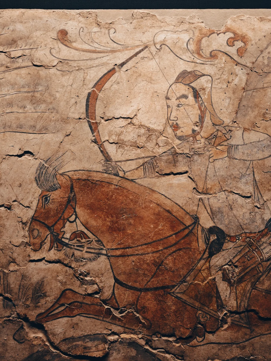 🛖黄土堆砌的墓道深处,一群画中人物正对你挤眉弄眼,骏马的眼神如影随形,而1400年前的乐队竟邀你合奏——这里可能是全山西最“不正经”的博物馆 🏤走进“一眼千年”遗址厅,玻璃地板下真实的墓道赫然在目。抬眼望见徐显秀墓《宴饮图》时,我差点笑出声—— 那位北壁正中央的徐大人,举着酒杯一脸“全场由我买单”的傲娇表情,旁边夫人端庄微笑,活脱脱古代版“领导讲话,夫人鼓掌”现场。 最抢戏的是那群乐伎 🧚‍♀️: 弹琵琶的腮帮子鼓得像含了俩鸡蛋,吹横笛的脸颊凹陷似被吸尘器袭击,打鼓的更是全身每个细胞都在呐喊“节奏不能停!” 馆长说这叫“铁线描”绝技——当年画师用铁丝般刚劲的线条,把人物微表情拿捏得死死的,放今天绝对能当美妆博主画眉教程。 🏛️站在水泉梁墓壁画前,我又被时尚暴击了: 侍女梳着“双马尾”丫鬟髻,武士蹬着尖头小皮靴,贵妇披着波西米风条纹裙。 尤其那个牵驼人,卷发高鼻梁配紧身裤,活脱脱北齐版“精神小伙” 🏫最让我破防的是娄叡墓《回归图》: 载货骆驼明明累得翻白眼,背上猴子还嬉皮笑脸荡秋千,原来打工人辛酸史早被古人画透了。 ⚔️北齐如同一颗短暂爆发的超新星,28年的时间里,6位皇帝更迭,堪称“六味地黄丸”,不过胡汉文化碰撞却催生出艺术高峰,壁画、石窟、音乐等成就为隋唐统一奠定美学基础。 正如徐显秀墓中那位粟特乐师跨越千年的凝望——北齐的混乱与辉煌,最终在敦煌的飞天与长安的宫廷乐中找到了回响。