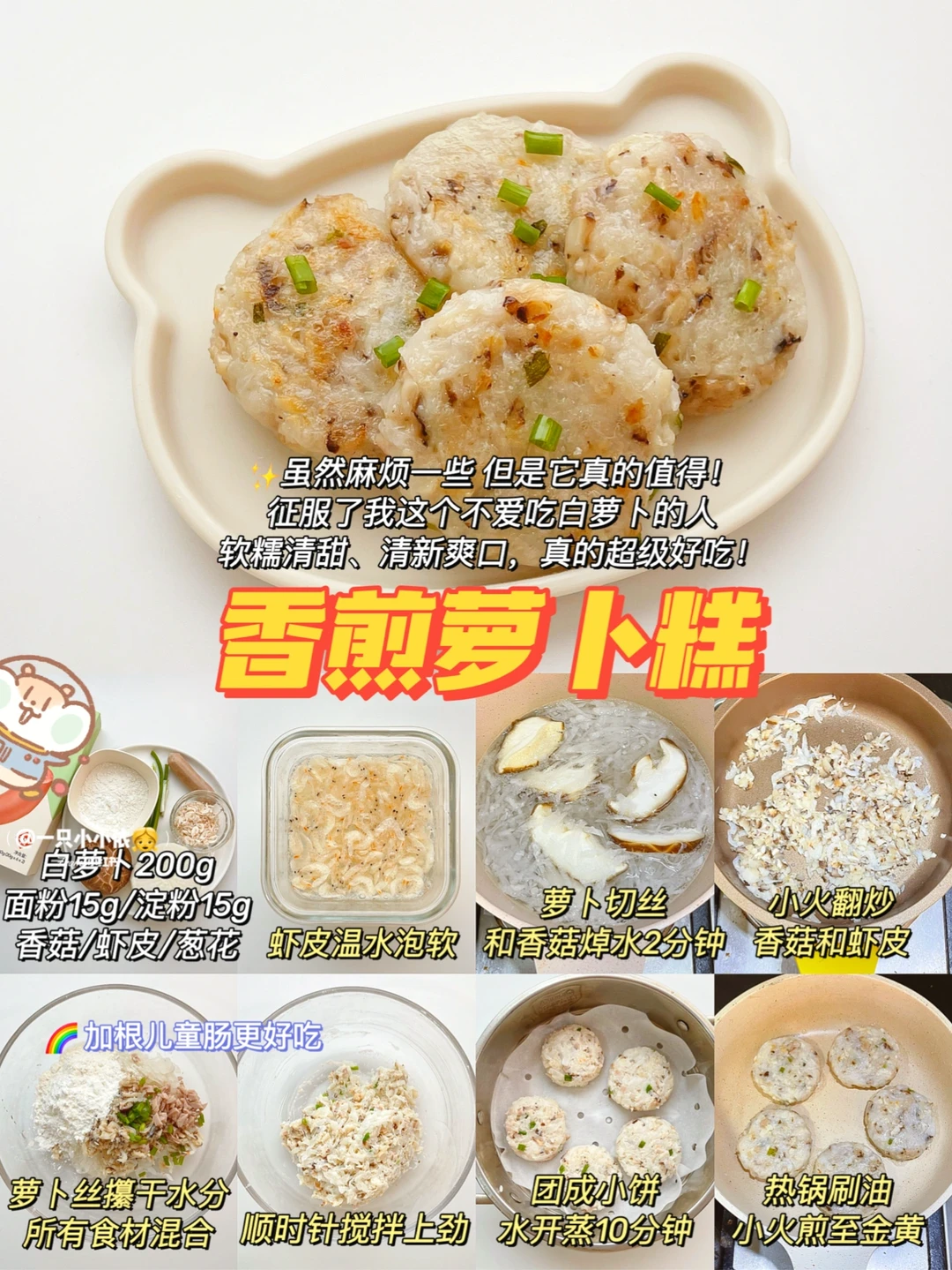 🔸做法:虾皮温水泡软;萝卜切丝,和香菇焯水2分钟;小火翻炒香菇和虾皮;萝卜丝攥干水分,所有食材混合,顺时针搅拌上劲;团成小饼,水开蒸10分钟;热锅起油,小火煎至金黄✅