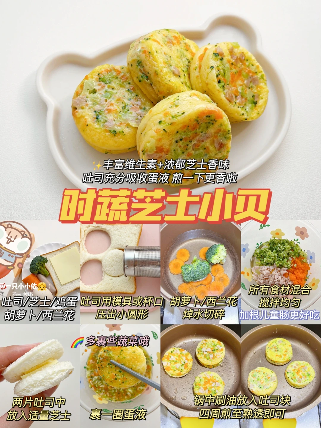 🔸做法:吐司用模具或杯口压出小圆形;胡萝卜和西兰花焯水切碎,所有食材混合搅拌均匀;两片吐司中放入适量芝士,裹一圈蛋液;锅中刷油放入吐司块,四周煎至熟透即可✅