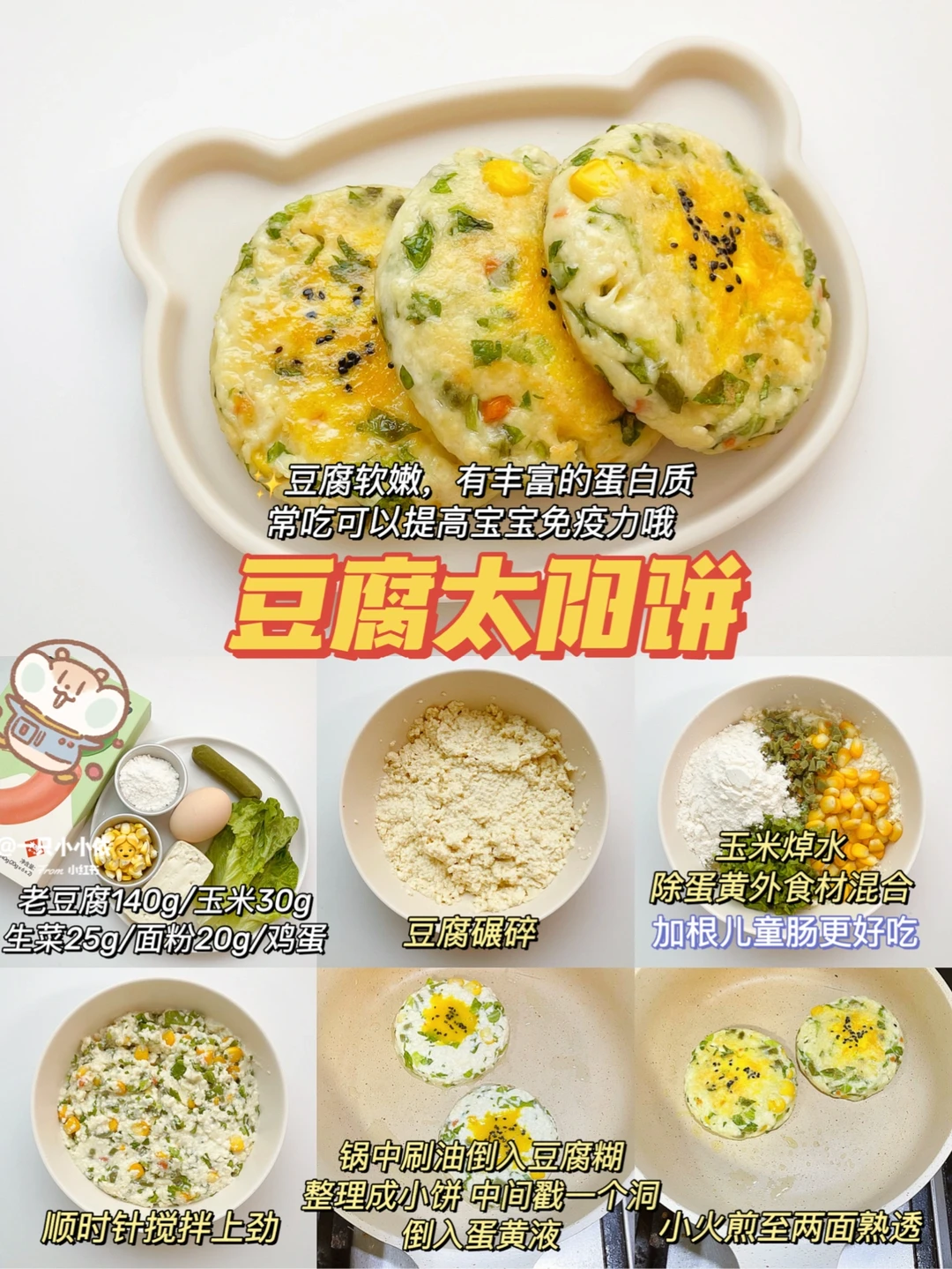 🔸做法:豆腐碾碎,玉米焯水,除蛋黄外食材混合,顺时针搅拌上劲;锅中刷油倒入豆腐糊,整理成小饼,中间戳一个洞,倒入蛋黄液,小火煎至两面熟透✅