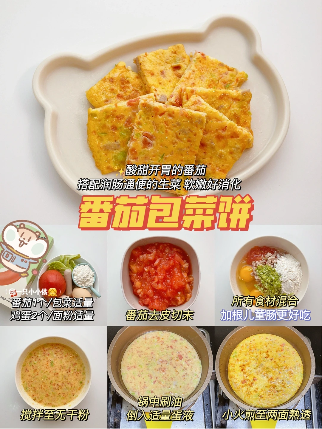🔸做法:番茄去皮切末,所有食材混合(加根儿童肠更好吃),搅拌至无干粉;锅中刷油,倒入适量蛋液,小火煎至两面熟透✅