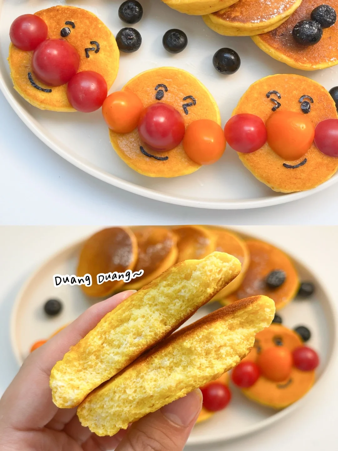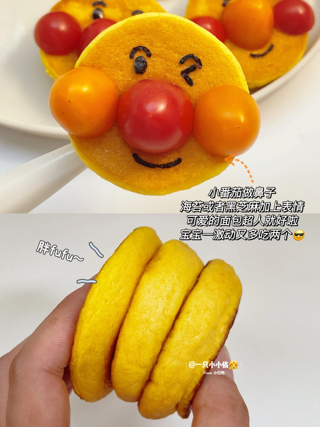 7⃣️番茄对半切开做鼻子和腮红,海苔或者黑芝麻酱加上表情就变面包超人啦!
