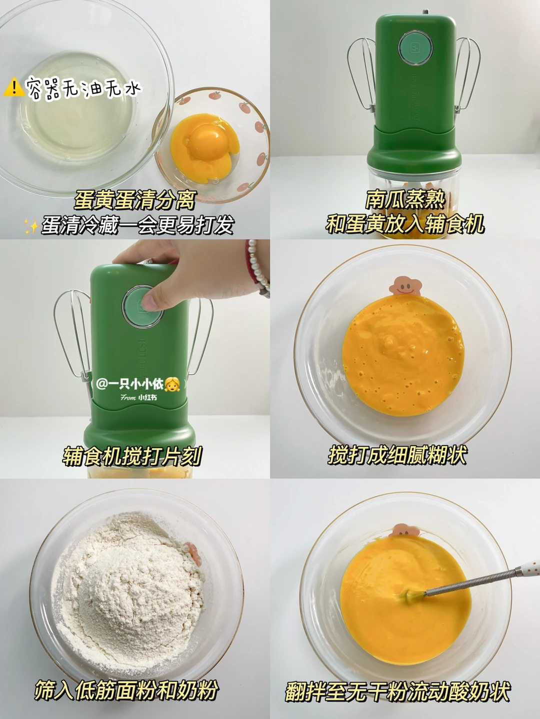 2⃣️南瓜蒸熟,和蛋黄放入无线辅食机搅打细腻,300m容量,1勺辅食也能搅;