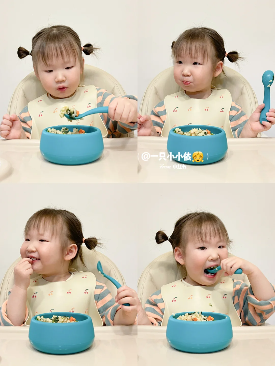 烩饭比汤稠、比大米饭稀,宝宝容易舀取且不掉落,特别适合锻炼宝宝自主进食~再搭配好用的餐具,可以事半功倍哦!