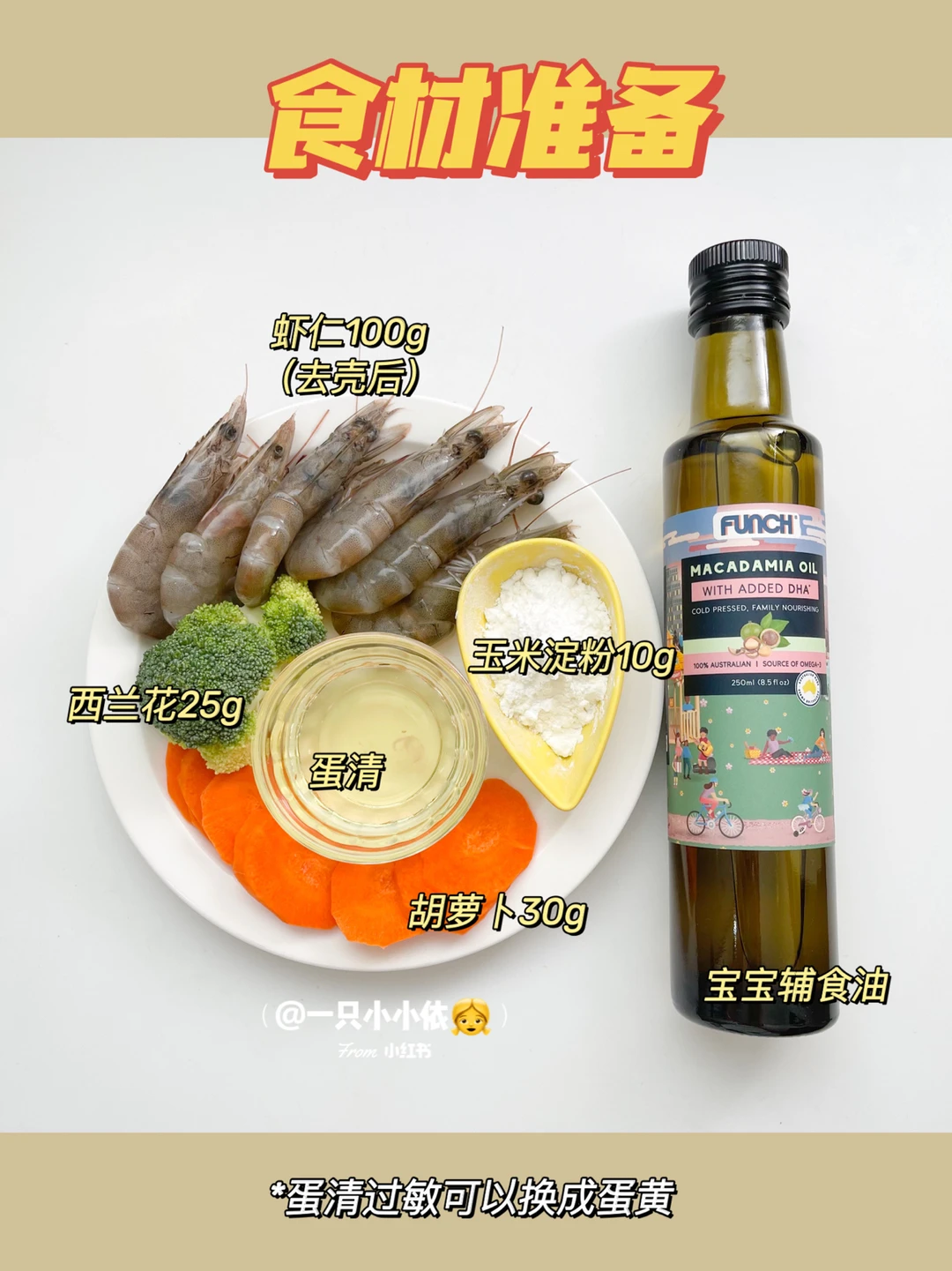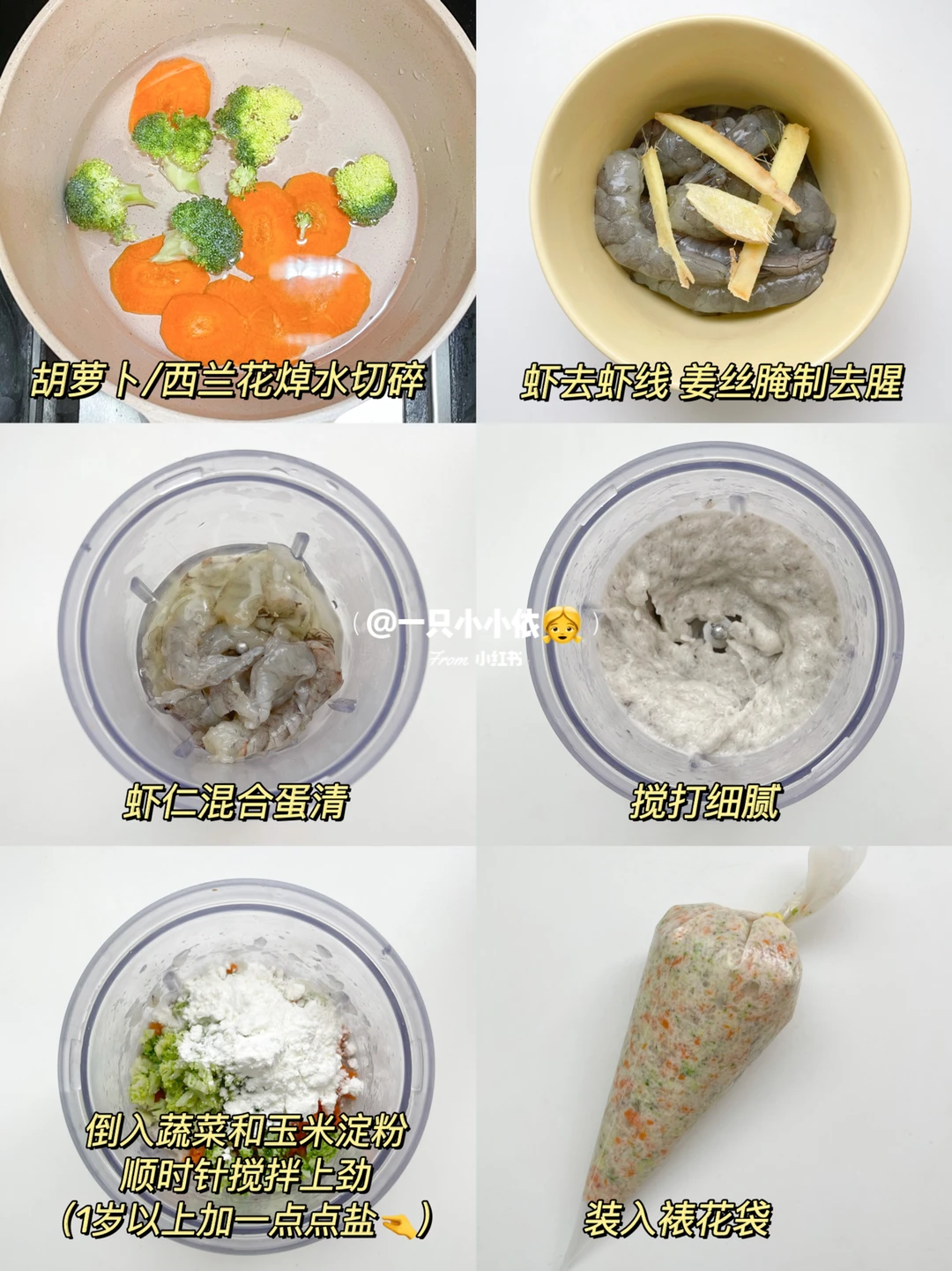 1⃣️胡萝卜、西兰花焯水切碎,虾仁去虾线,姜丝腌制去腥;
