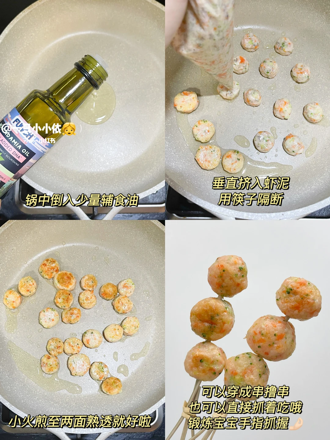 3⃣️锅中倒入夏威夷果油,垂直挤入虾泥,用筷子隔断,小火煎至两面熟透就好啦