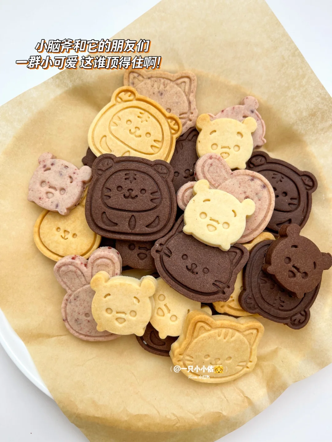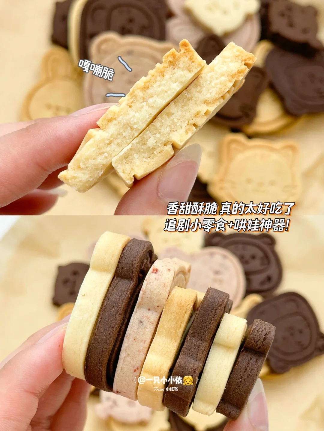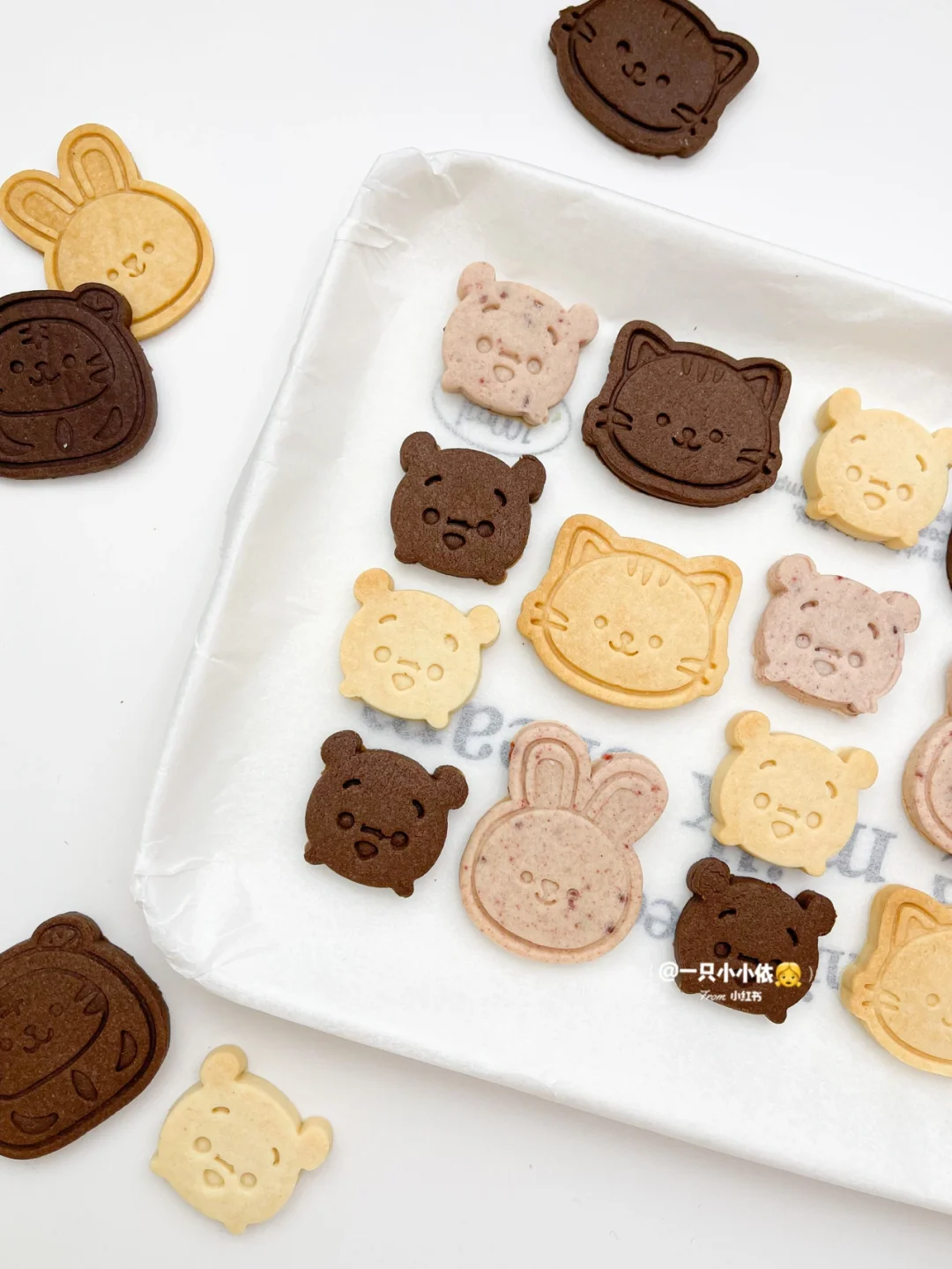 🐯小脑斧和它的朋友们组团来卖萌,这谁顶得住啊!当然是嗷呜一口全吃掉[斜眼R] 🧚‍♀️超简单的炼乳小饼干,香甜酥脆嘎嘣脆,烘焙小白也能成功👏🏻一次解锁三种口味,原味、草莓味、可可味,是追剧小零食,也是哄娃神器!打包起来送人也🉑️哦,投喂小可爱bi备! · 🌈食材准备 👉原味:黄油35g、炼乳40g、低筋面粉90g、玉米淀粉10g、糖粉10g、盐0.5g 👉可可味:黄油35g、炼乳40g、低筋面粉80g、玉米淀粉10g、糖粉10g、盐0.5g、可可粉10g 👉草莓味:黄油35g、炼乳40g、低筋面粉80g、玉米淀粉10g、糖粉10g、盐0.5g、草莓粉10g · 🌈制作步骤: 1⃣️黄油软化,加入糖粉打发至细腻蓬松; 2⃣️倒入炼乳搅拌至无干粉 3⃣️筛入低粉+玉米淀粉,揉成不粘手的面团(如果同时做三个口味,就将面糊平均分为3份,筛入对应的低粉/玉米淀粉/果蔬粉); 4⃣️面团用油纸包住,擀成厚片,冷冻稍变硬后取出,用模具压出形状; 5⃣️烤箱预热上下火160度15分钟 · 🌈唠叨几句—— ✨没有模具的姐妹,直接切成小方块也很可爱 ✨可以将果蔬粉换成南瓜粉、紫薯粉、抹茶粉等,解锁更多口味; ✨烤箱以自家温度为准,不要烤糊了 ✨烤好后记得密封储存,不然会受潮,5天内吃光光哦 · 🐯萌宠炼乳小饼干,双击屏幕随时抄作业哦! 🐯感谢海氏i7烤箱邀请体验,真诚分享[大笑R] 👋下期见啦