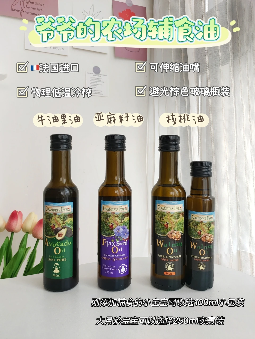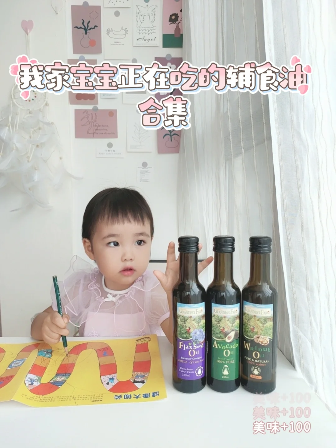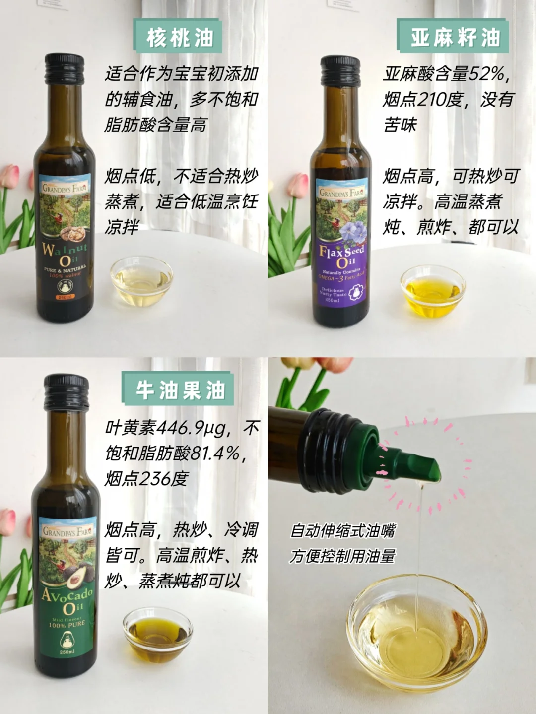 🔸辅食多样化后,再搭配亚麻酸较高的👉🏻亚麻籽油和不饱和脂肪酸含量高的手指👉🏻牛油果油交替使用,两款的营养成分不同,可以选烟点高的,热炒使用的比较快,轮流食用,并搭配凉拌的核桃油。