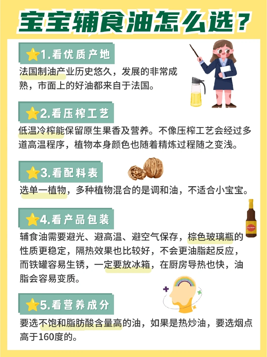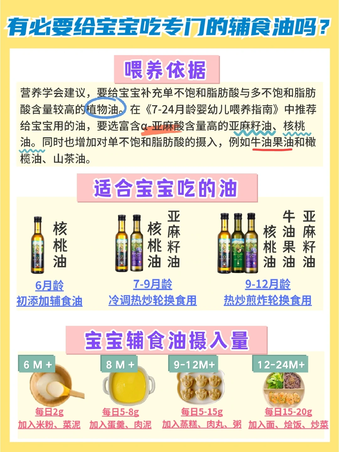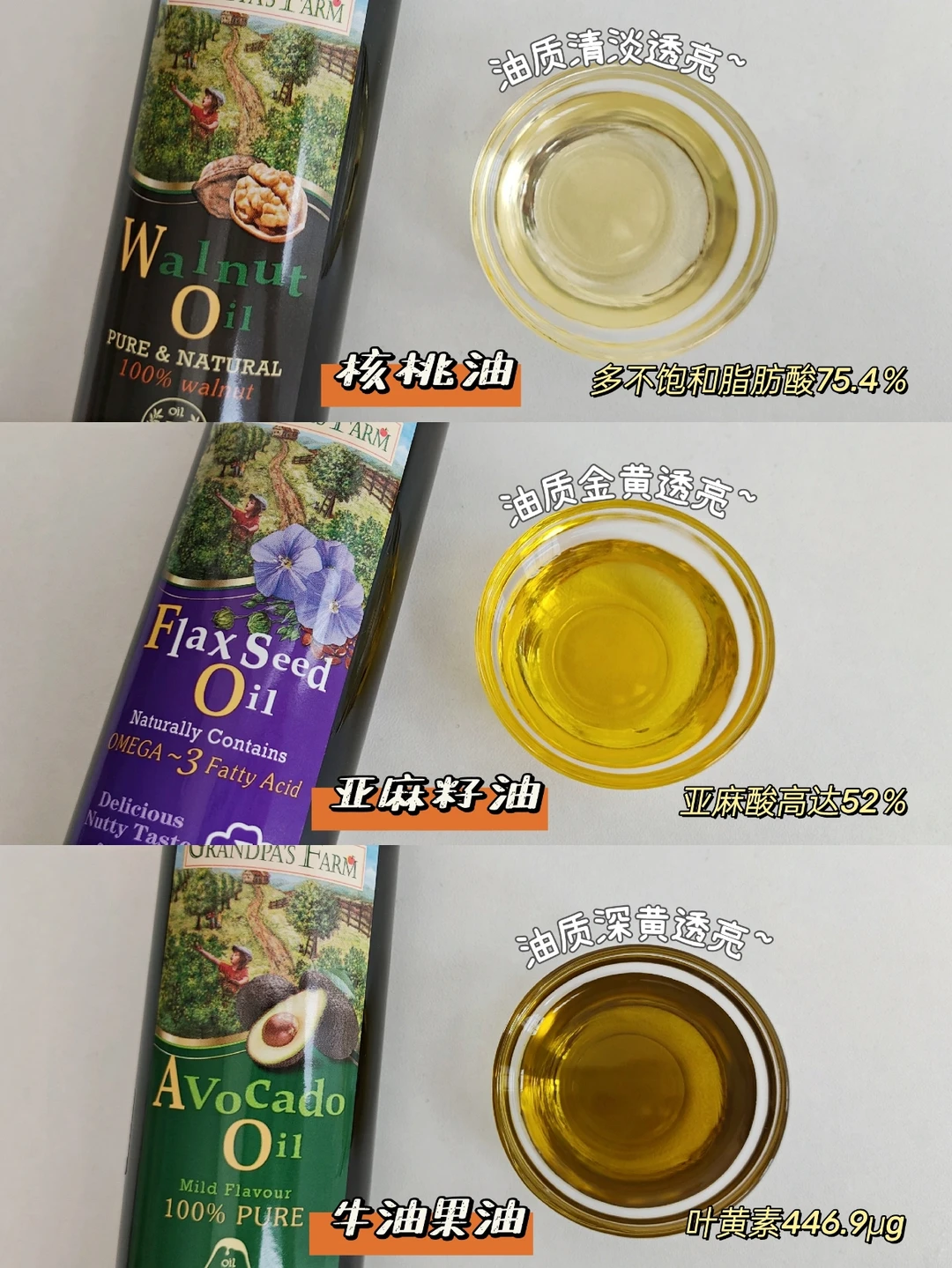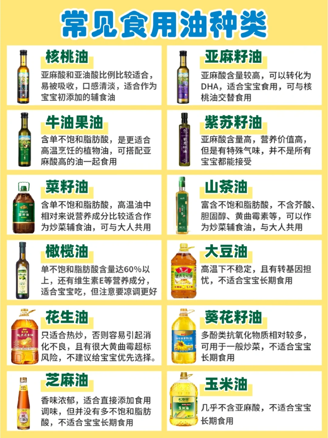 🔸辅食多样化后,再搭配亚麻酸较高的👉🏻亚麻籽油和不饱和脂肪酸含量高的手指👉🏻牛油果油交替使用,两款的营养成分不同,可以选烟点高的,热炒使用的比较快,轮流食用,并搭配凉拌的核桃油。