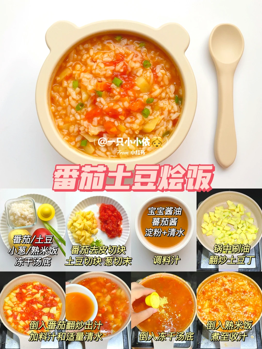 🔹步骤:番茄去皮切块,土豆切块,小葱切末;调料汁(宝宝酱油+番茄酱+淀粉+清水);锅中刷油翻炒土豆丁,倒入番茄翻炒出汁,加料汁和适量清水,倒入冻干汤底;倒入熟米饭煮至收汁✅