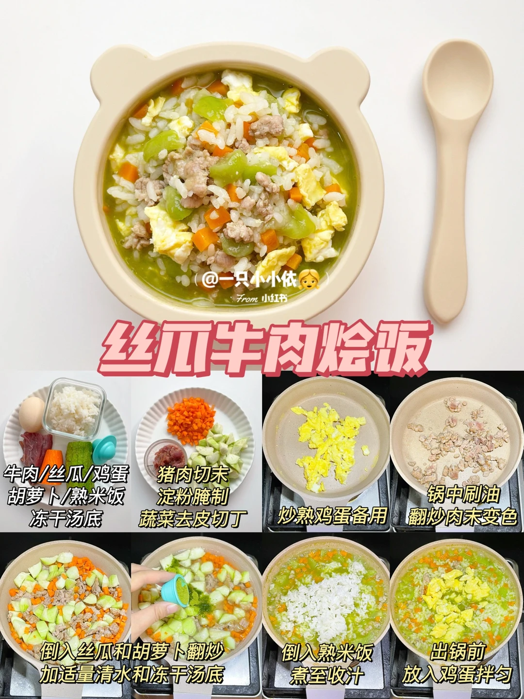🔹步骤:猪肉切末淀粉腌制,蔬菜去皮切丁,鸡蛋炒熟备用;锅中刷油翻炒肉末变色,倒入丝瓜和胡萝卜翻炒,加适量清水和冻干汤底;倒入熟米饭煮至收汁,出锅前放入鸡蛋拌匀✅