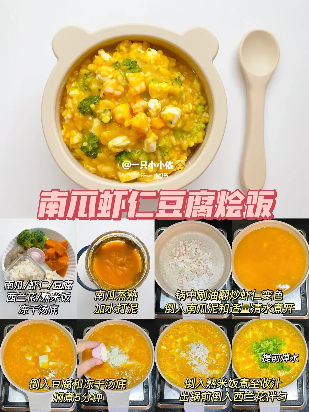 🔹步骤:南瓜蒸熟加水打泥;锅中刷油翻炒虾仁变色,倒入南瓜泥和适量清水煮开;倒入豆腐和冻干汤底,焖煮5分钟;倒入熟米饭煮至收汁,出锅前倒入西兰花(提前焯水)拌匀✅