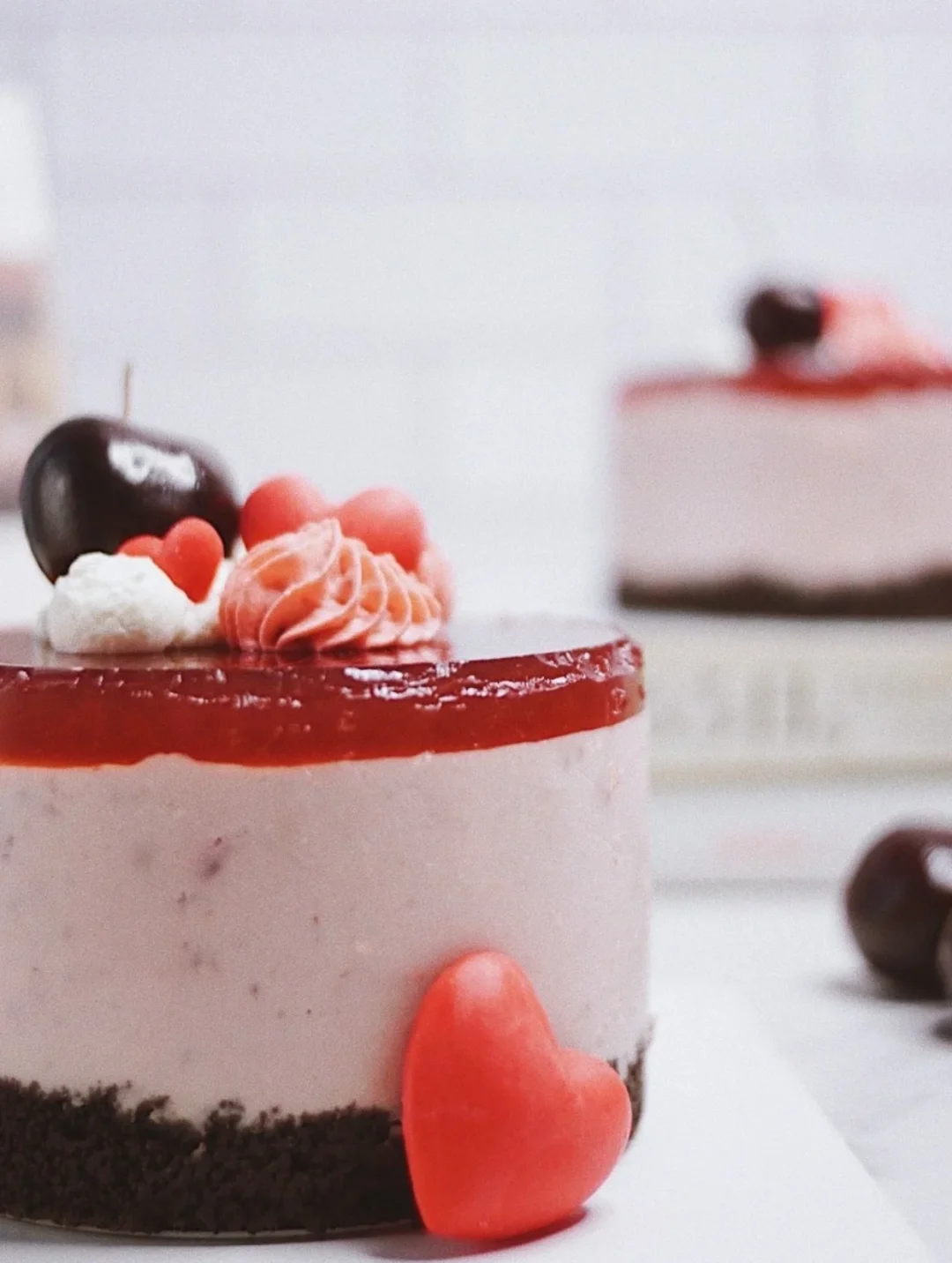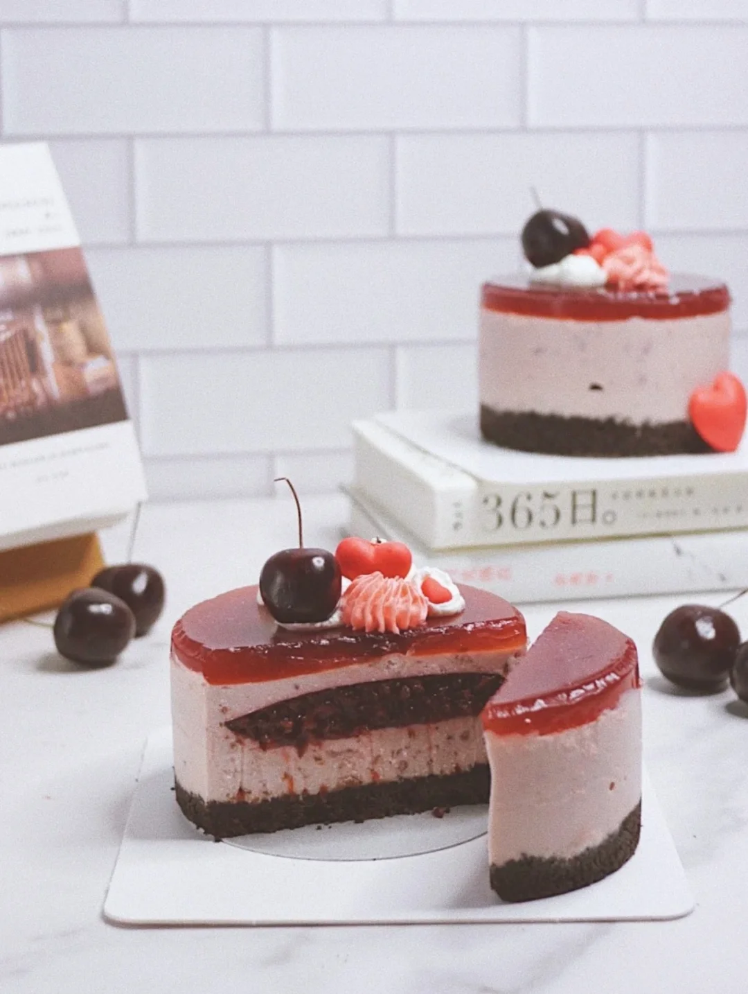 🥀细腻的乳酪慕斯,入口轻抿,一丝带有甜甜酒意的库里夹心,融化在舌腔。Q弹爽滑的果茸淋面,繁琐却并不难