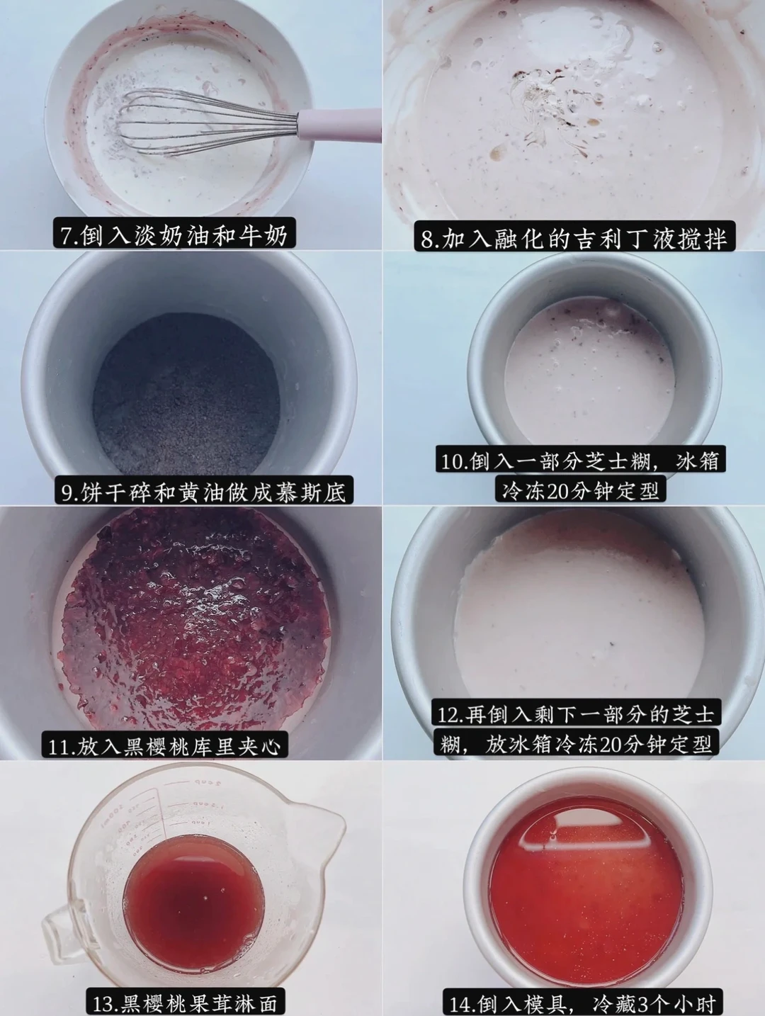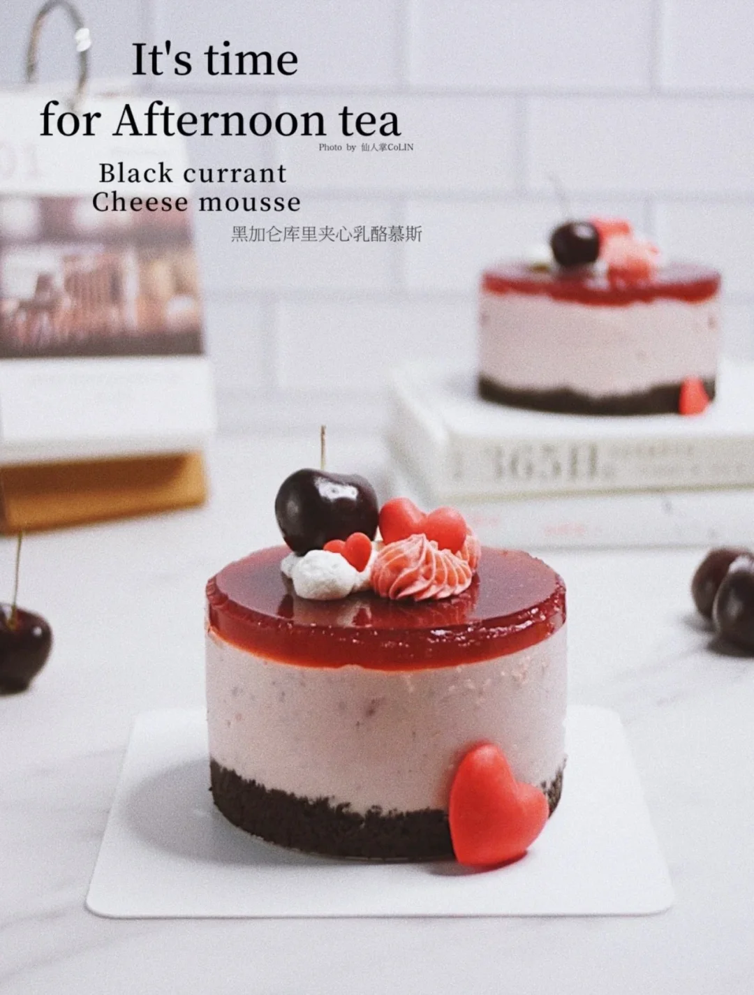 🃏如果初次接触法式甜品的制作,那这个在合适不过。整个甜品由❹部分组成:饼干底、库里夹心、黑加仑乳酪慕斯以及果茸淋面。主要是黑樱桃果茸酱的熬煮🍒因为库里夹心和淋面都是在果茸酱的基础上进行了简单的增减。慕斯体我用了少量的黑加仑利口酒,来丰富层次。