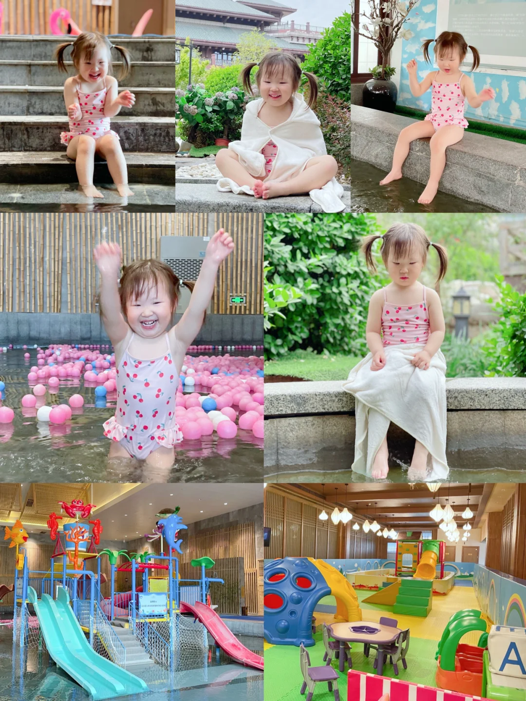 温泉是这趟旅行的重点,这里的温泉分室内外,总共有40多个泡池,有红酒浴、酵素浴、鱼疗等。室内有水上乐园和海洋球,适合宝宝玩;室外环境很好,边泡温泉边呼吸新鲜空气,太爽啦!而且园林是中式的,还有汉服体验,拍照很出片🤳