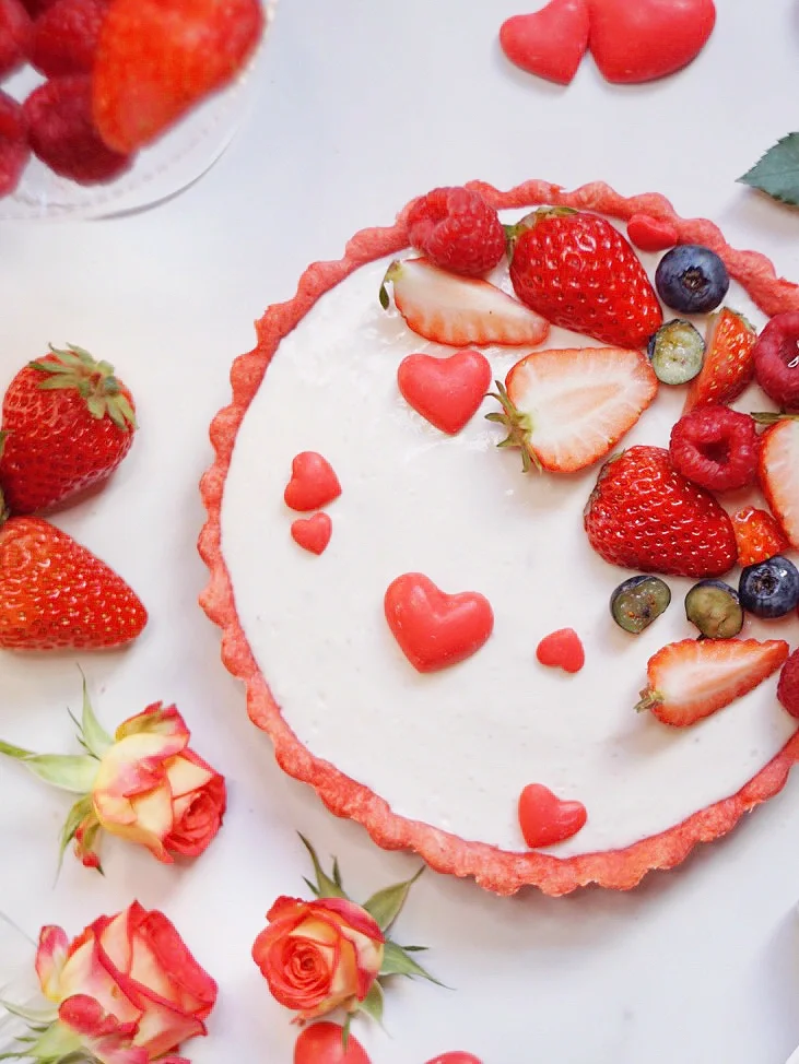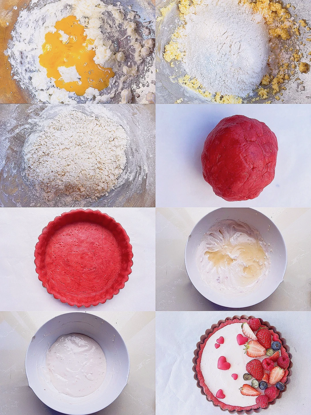 挞皮:红丝绒液3g 黄油60g 细砂糖35g 低筋面粉150g 常温全蛋液30g