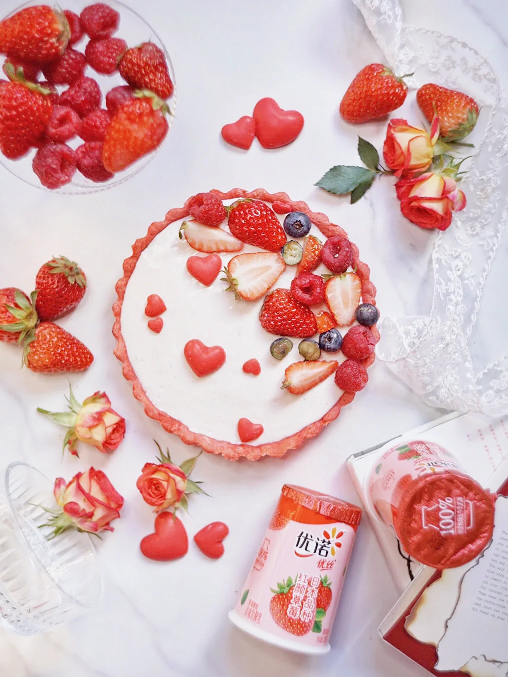 4️⃣优诺红颜草莓味酸奶均匀铺满挞皮,放冰箱冷藏2个小时。