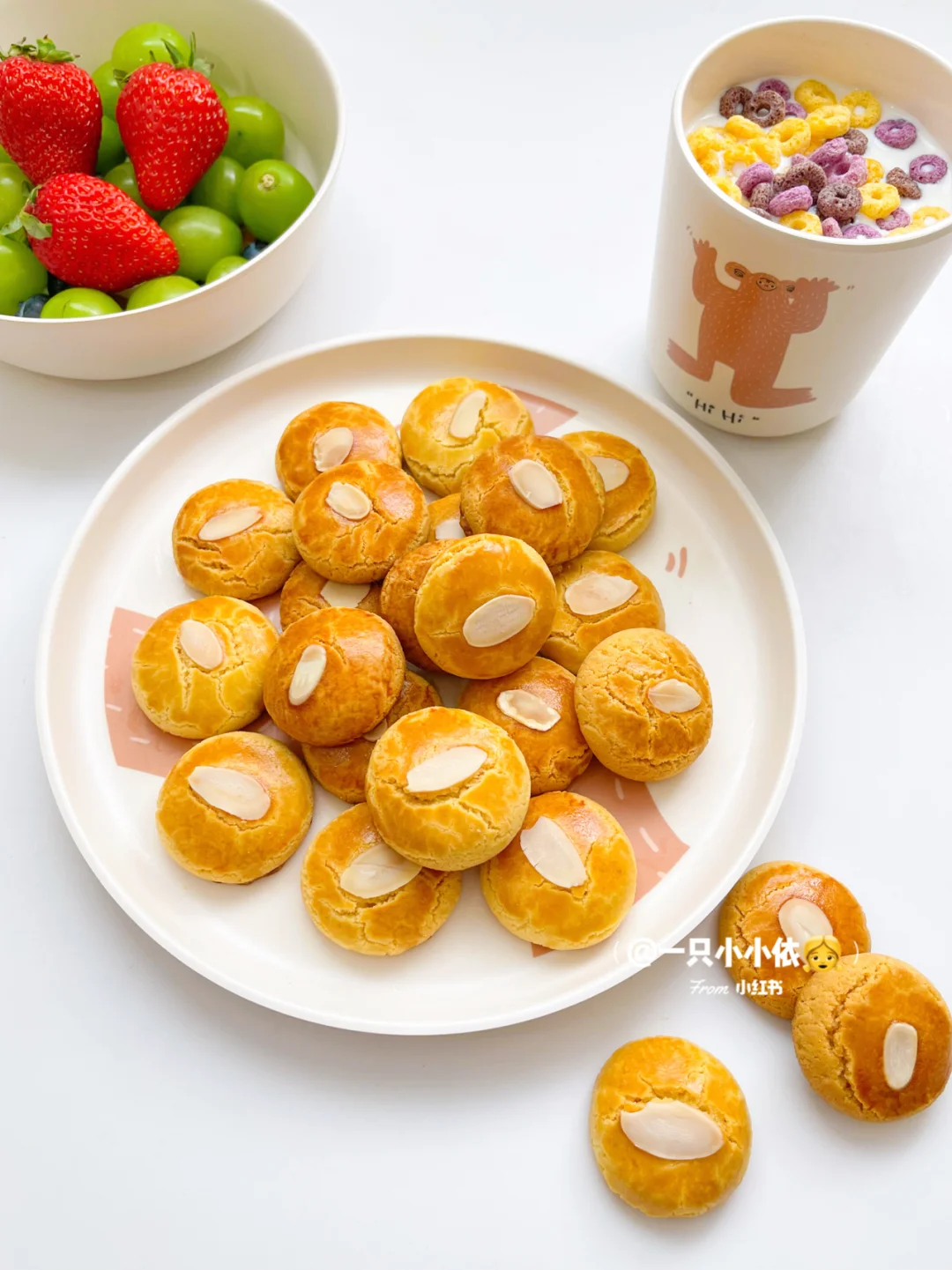 4⃣️表面刷一层蛋液,放上杏仁片,烤箱预热后上下火170度20分钟就好啦✅