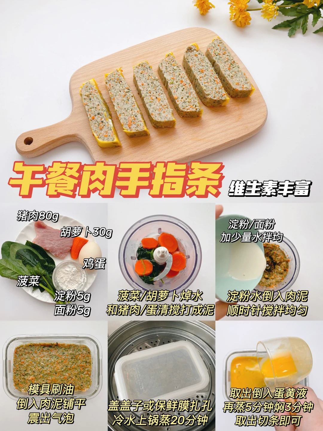 食材:猪肉、菠菜、胡萝卜、鸡蛋、面粉、淀粉