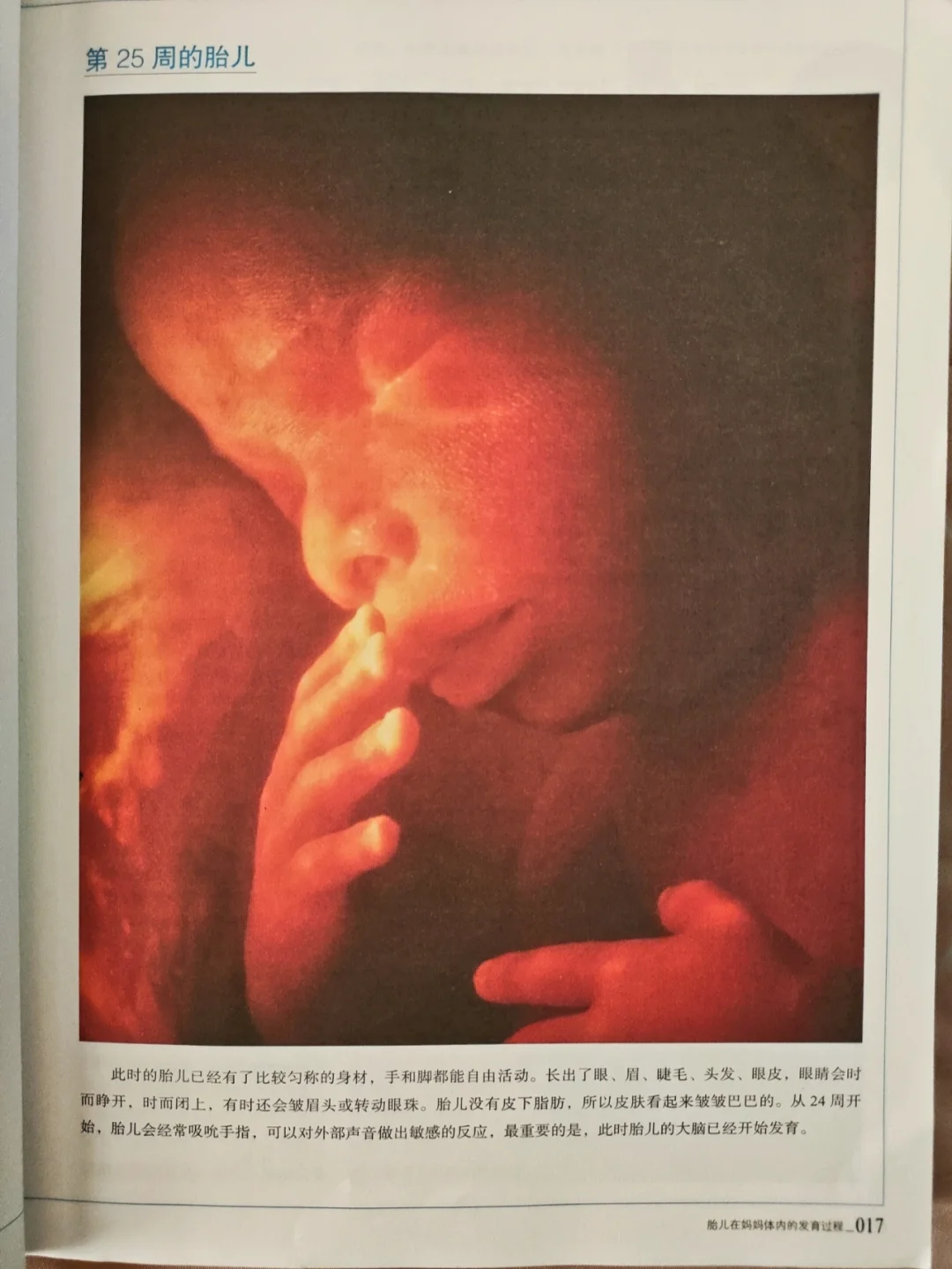 🍀6个月:胎儿的头发,眉毛、睫毛越发清晰了。胎儿很瘦,皮肤表层附着一层白色雪花膏状的物质,皮肤皱皱的。可以听到妈妈心跳和说话了。