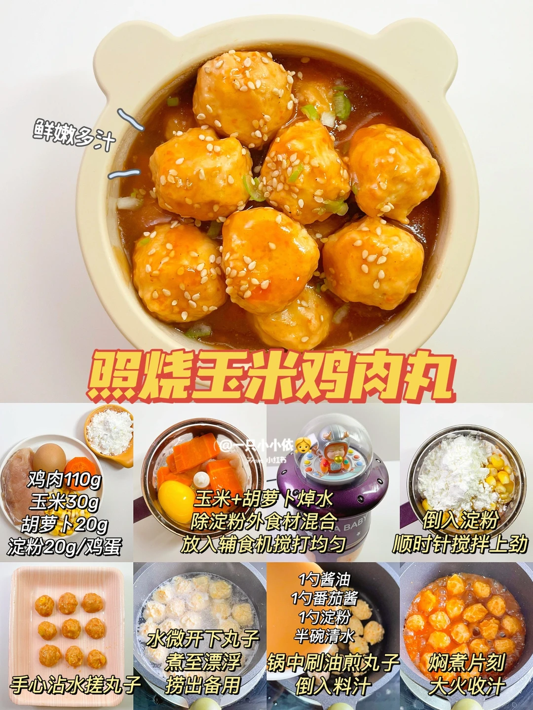 🔹做法:玉米和胡萝卜焯水,除淀粉外食材混合,辅食机搅打细腻;倒入淀粉顺时针搅拌上劲,手心沾水搓丸子,水微开下丸子,煮至漂浮捞出备用;锅中刷油煎丸子,倒入料汁(酱油+番茄酱+淀粉+清水);焖煮片刻大火收汁
