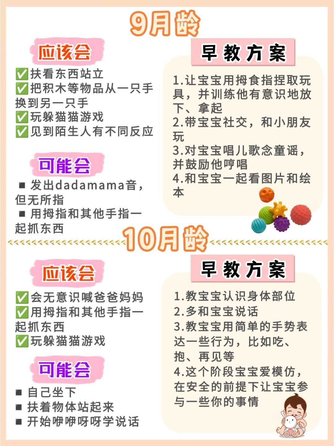 ✅十月龄:手指的精细动作发育更好,会主动表达自己的情绪和想法,会区分双手使用,喜欢拆开和重组东西,喜欢捉迷藏,可以培养亲子阅读;