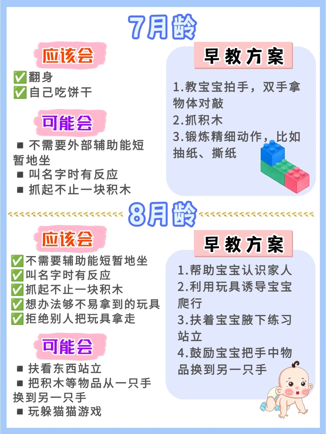 ✅八月龄:开始学爬行,初步模仿,会找藏起来的东西,重点引导爬行,多陪宝宝做亲子游戏互动