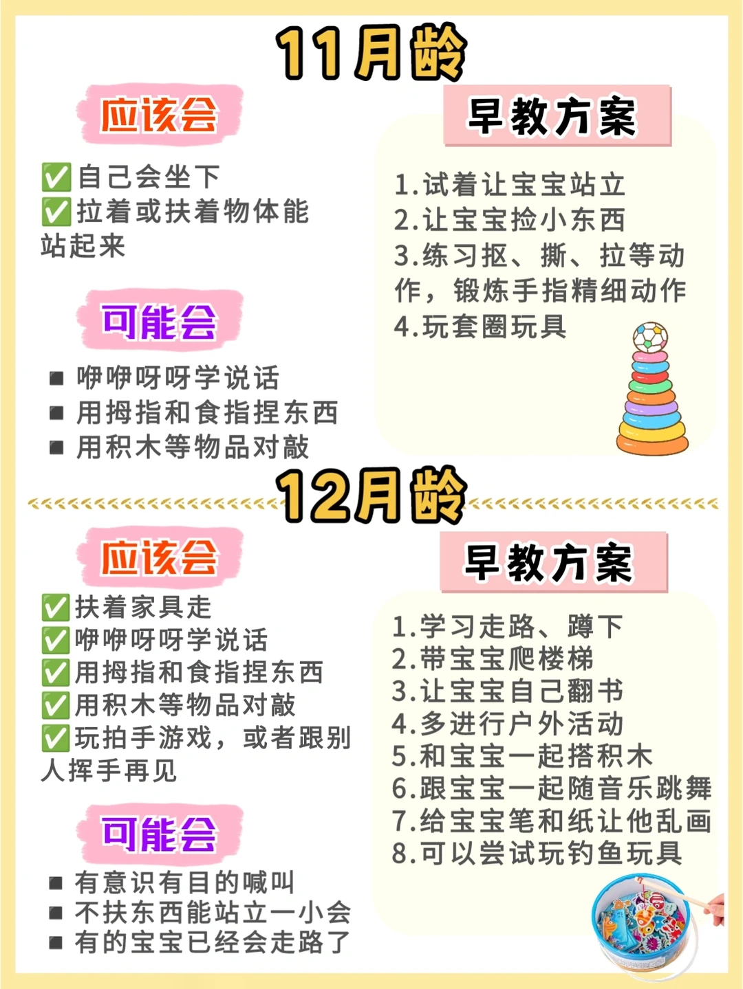 ✅十二月龄:多鼓励宝宝表达,训练自己说话,重点多锻炼宝宝手指灵活练翻书,锻炼精细动作,自我意识开始萌芽,学会拒绝;玩绕珠类玩具,锻炼手眼协调,训练图案认知。