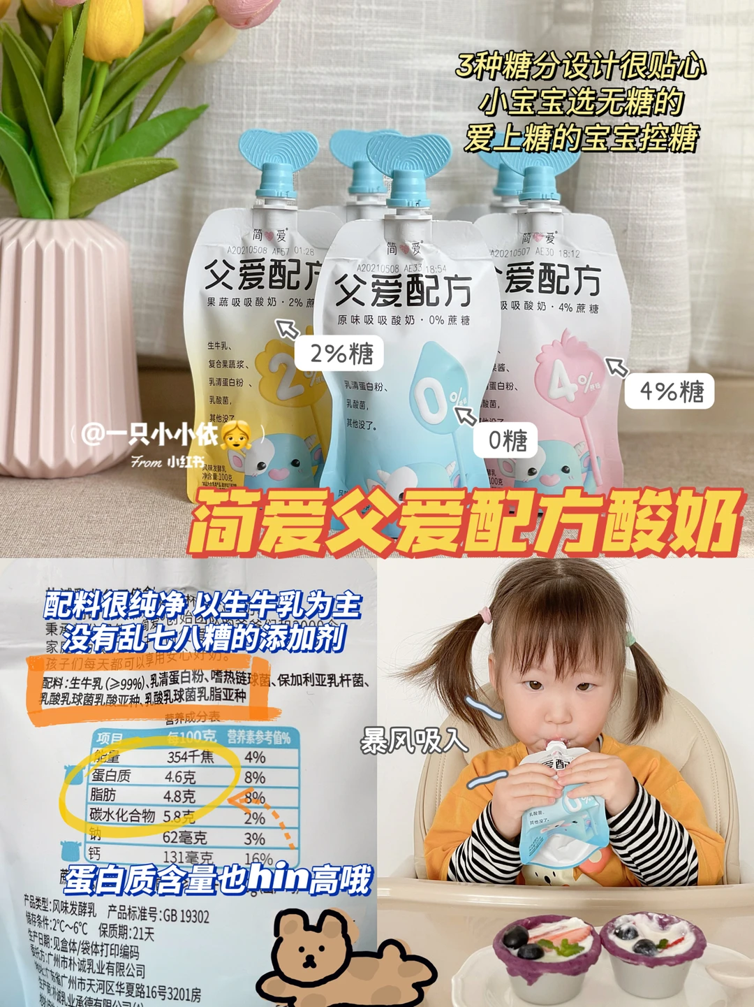 小小依喝的第一口酸奶,就是简爱父爱配方家的蓝色那款😄它们家配料表很干净,三款糖分设计很贴心,无糖那款只有生牛乳、乳清蛋白粉和乳酸菌,有糖的甜味也都是来自天然果蔬果酱😌乳糖不耐的宝宝,可以用它补充蛋白质摄入;做了功课后了解到他们家奶源很干净,有各种检测报告,可以放心喝;吸吸乐的包装不容易洒,小小依自己拿着疯狂吸入哈哈哈!
