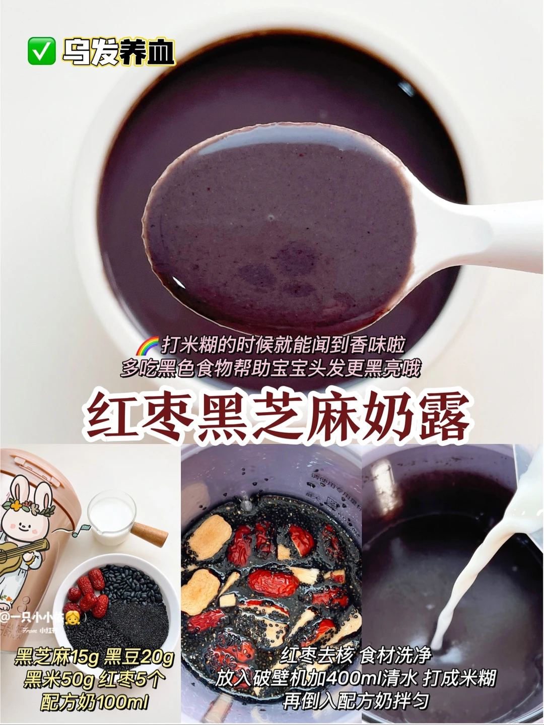 👉食材:黑芝麻15g、黑豆20g、黑米50g、红枣5个、清水400ml、配方奶100ml